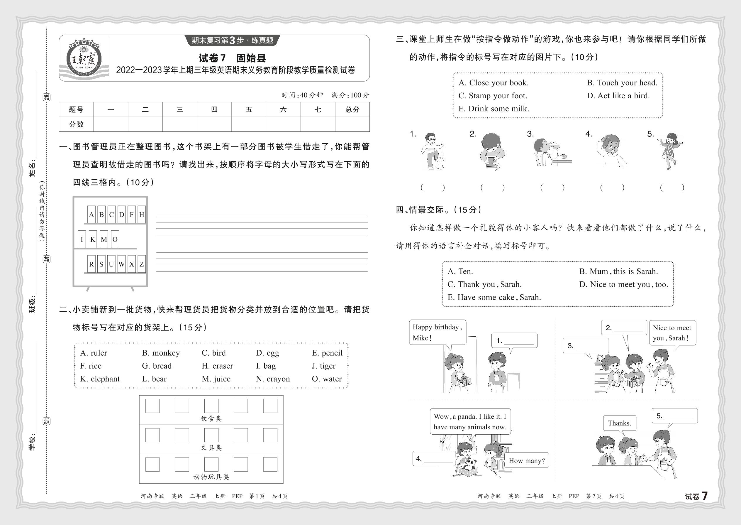 河南省信阳市固始县2022—2023学年上期三年级英语期末义务教育阶段教学质量检测试卷(人教PEP版)【7】