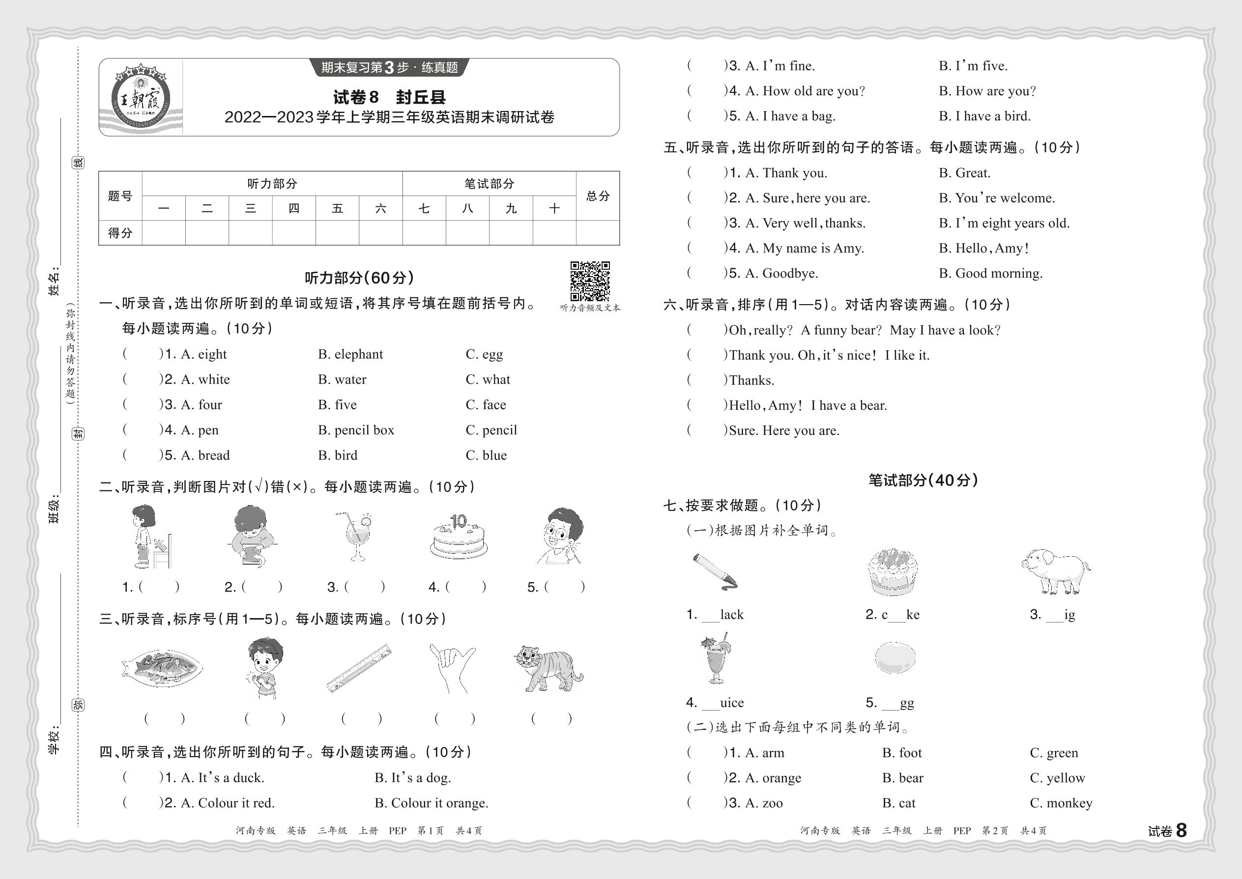 河南省新乡市封丘县2022—2023学年上学期三年级英语期末调研试卷(人教PEP版)【8】