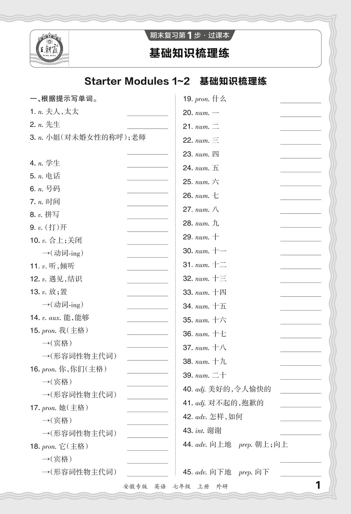 2023秋上册七年级英语外研版 期末过课本·Starter Modules 1~2 基础知识梳理练