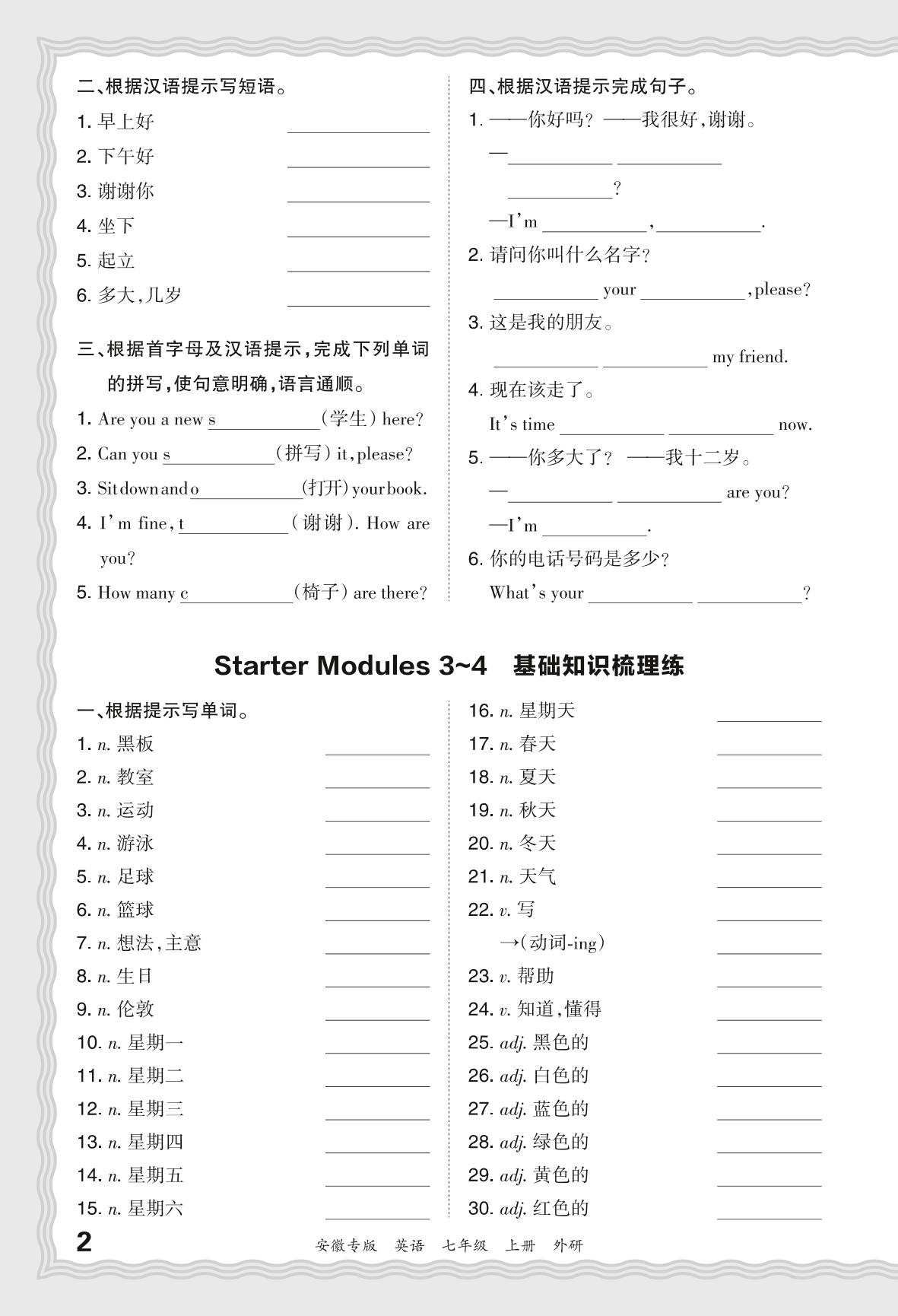 2023秋上册七年级英语外研版 期末过课本·Starter Modules 3~4 基础知识梳理练