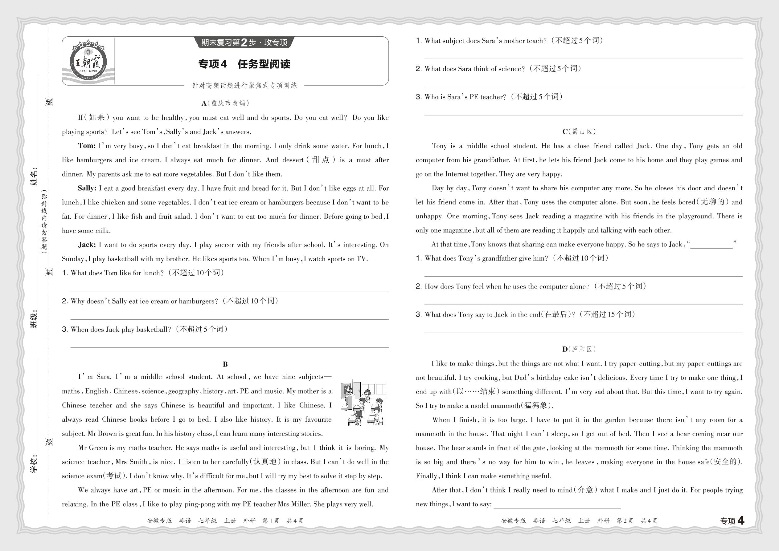 2023秋上册七年级英语外研版 期末专项卷·任务型阅读【4】