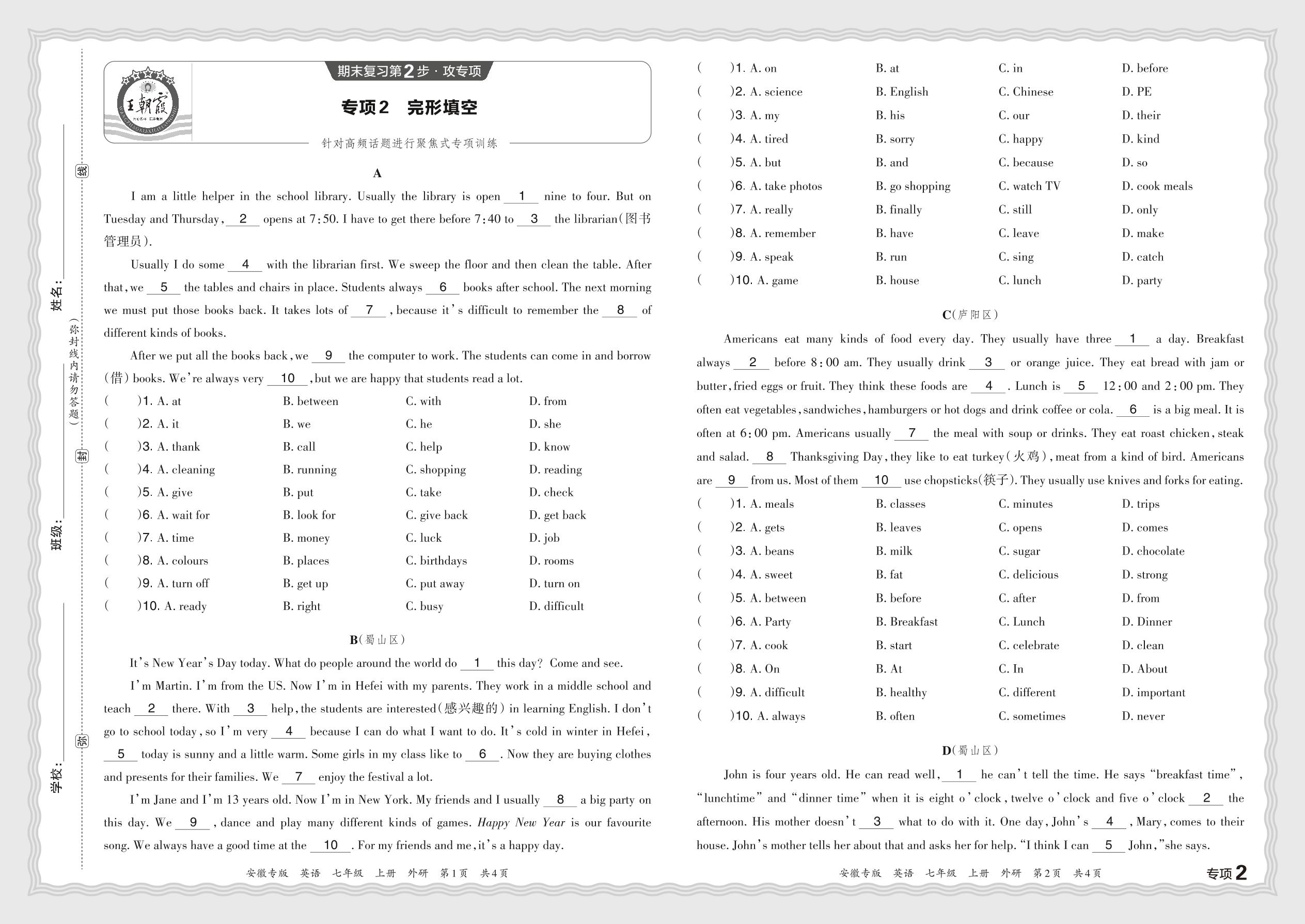 2023秋上册七年级英语外研版 期末专项卷·完形填空【2】