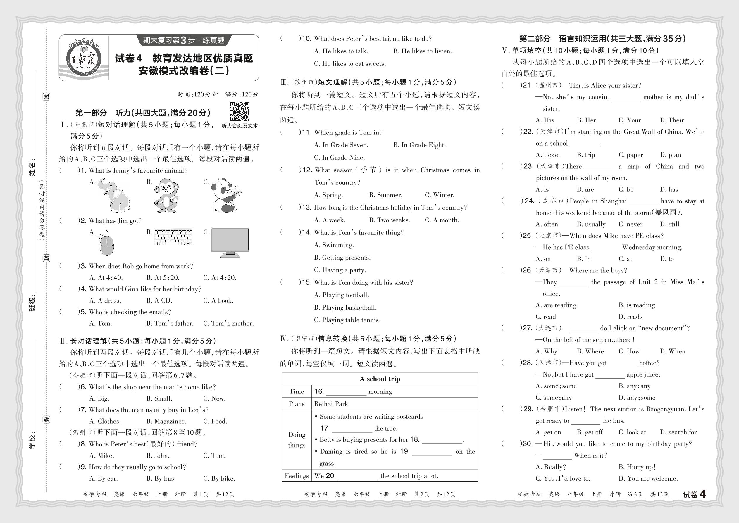 2023年秋教育发达地区优质真题安徽模式改编卷(二)七年级上册期末英语(外研版)【4】