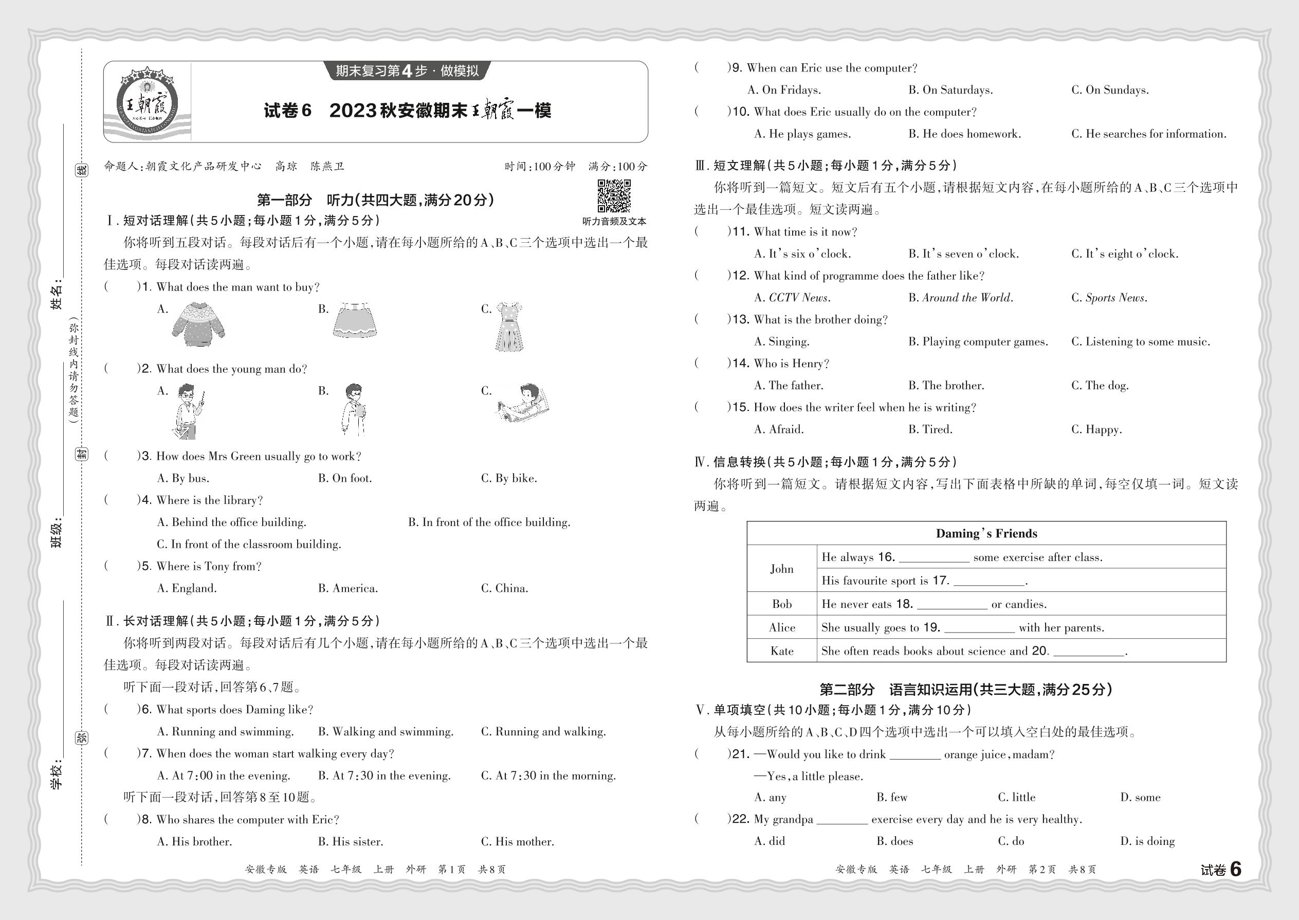 2023秋上册七年级英语外研版 安徽期末王朝霞一模