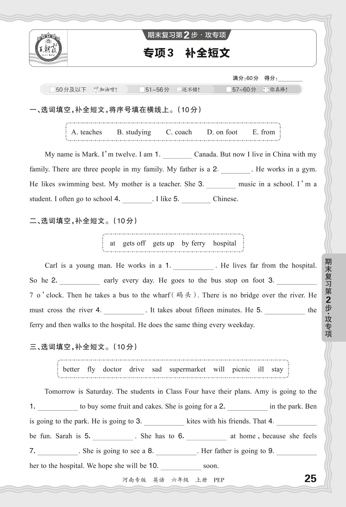 2023秋上册六年级英语人教PEP版 期末专项卷·补全短文【3】