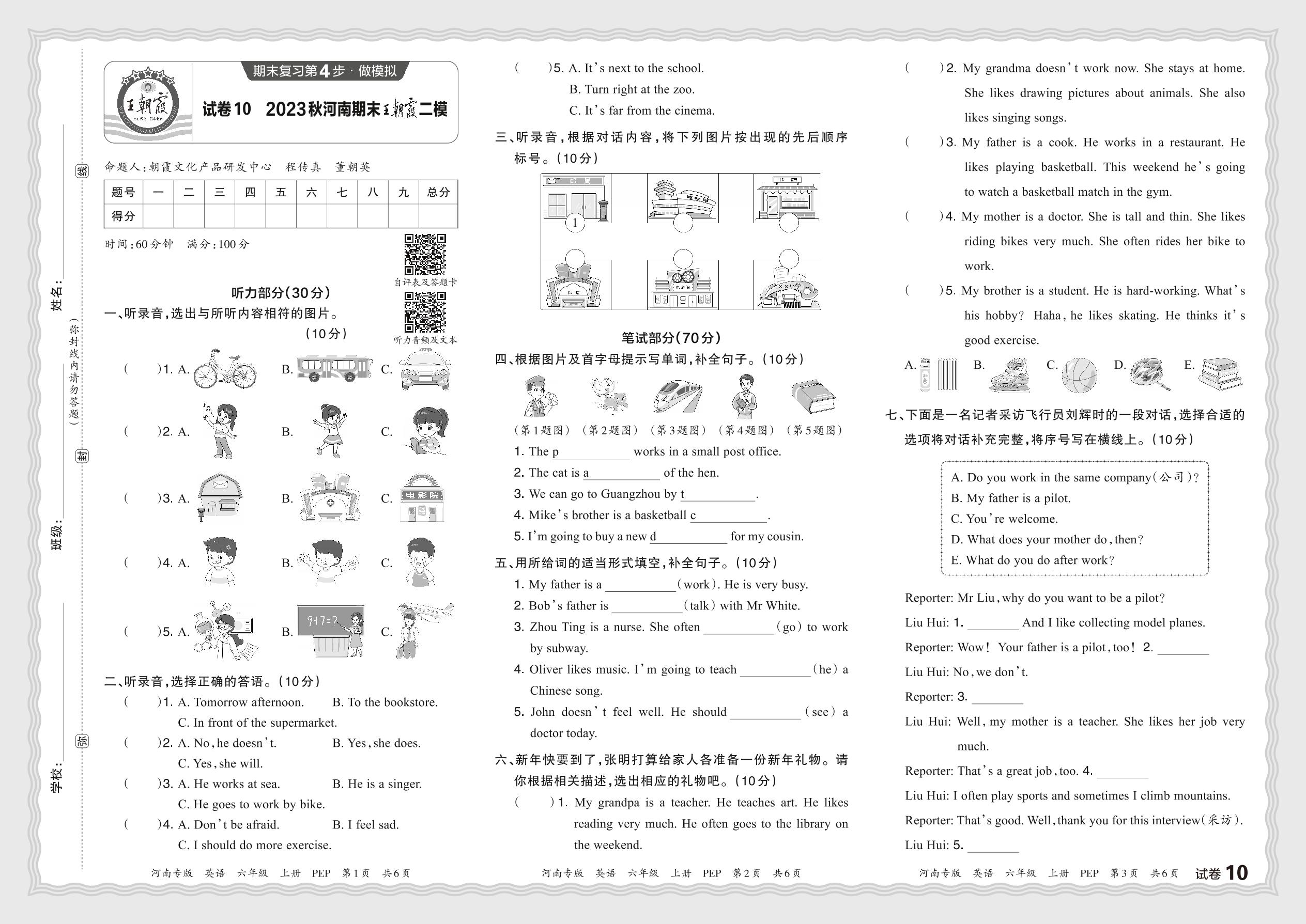 2023秋上册六年级英语人教PEP版 河南期末王朝霞二模【10】