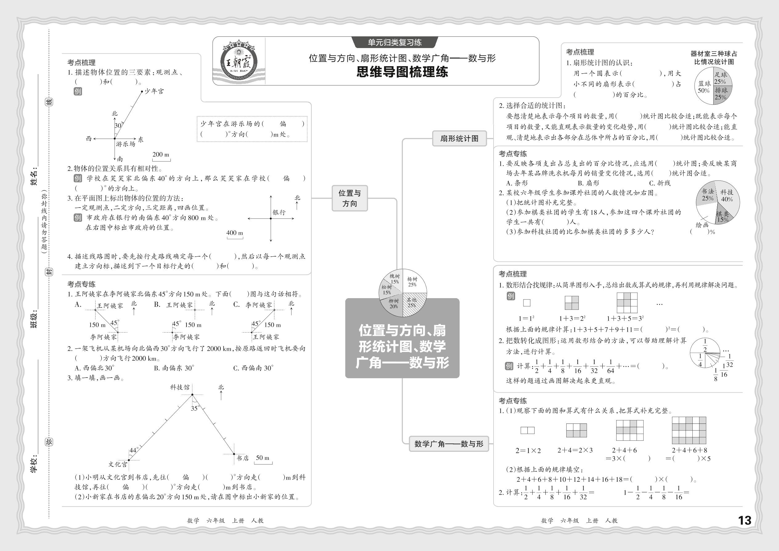 2023秋上册六年级数学人教版 期末过课本·单元归类复习练——位置与方向、扇形统计图、数学广角——数与形【6】