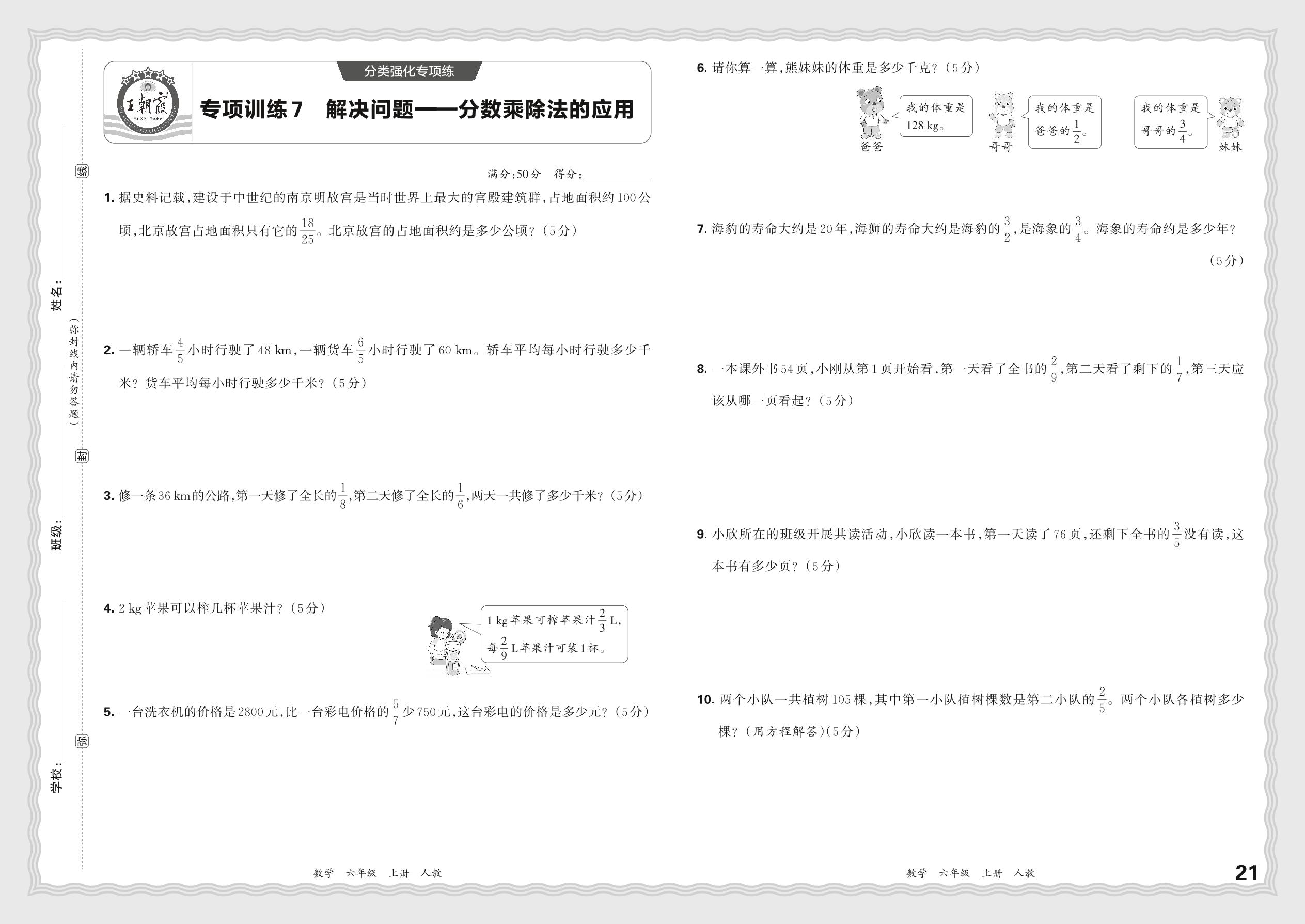 2023秋上册六年级数学人教版 期末专项·解决问题——分数乘除法的应用【7】