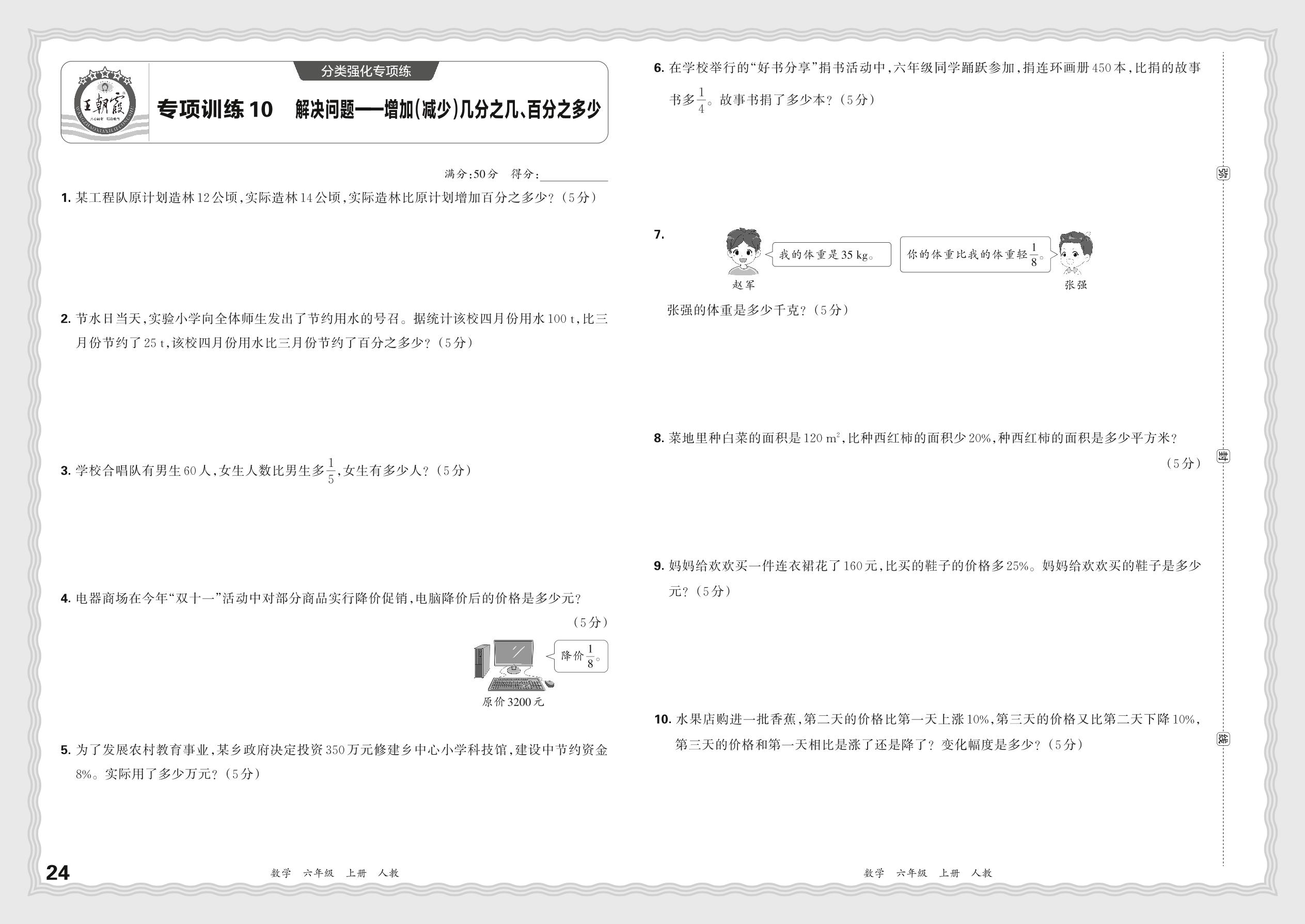 2023秋上册六年级数学人教版 期末专项·解决问题——增加(减少)几分之几、百分之多少【10】