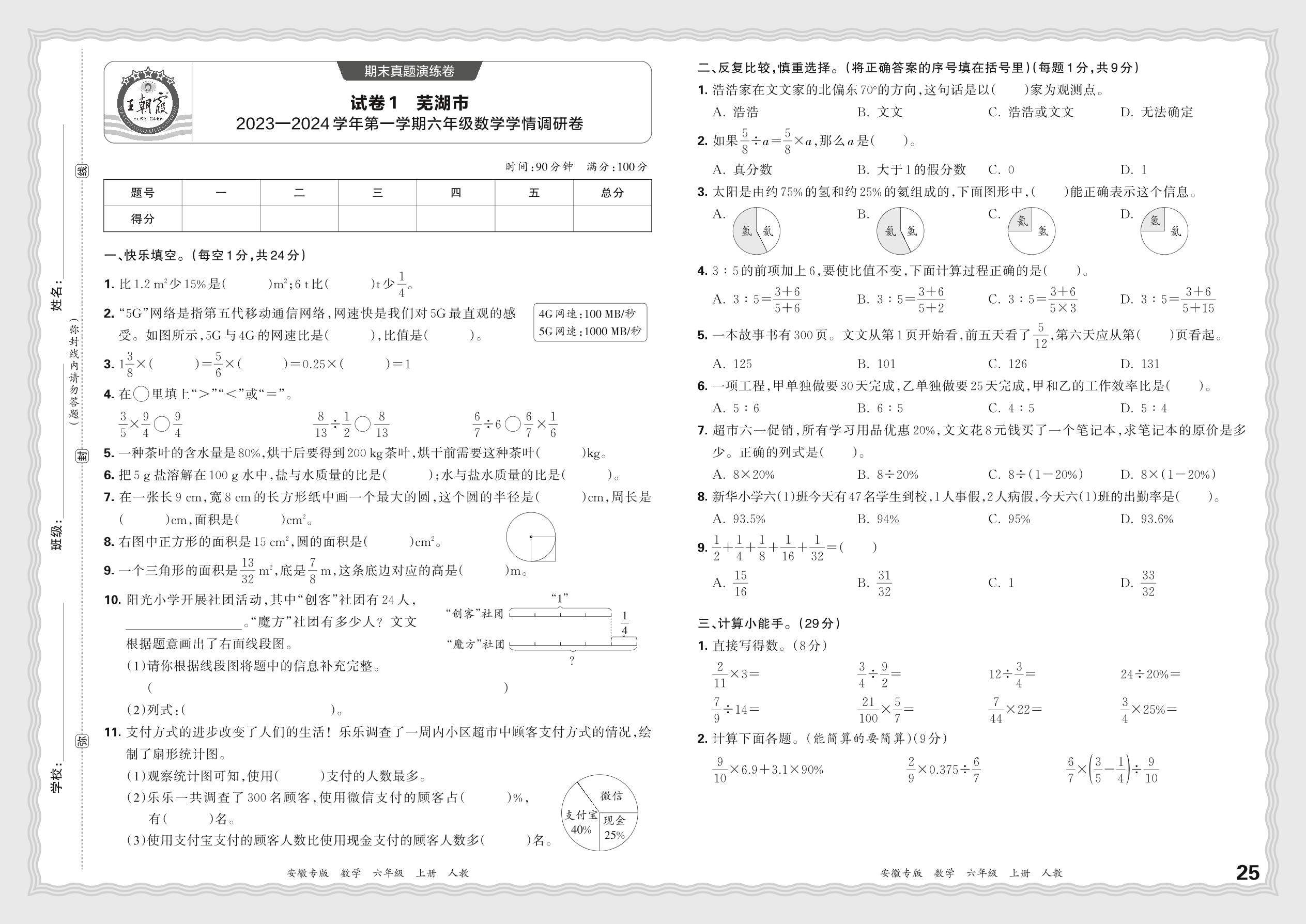 安徽省芜湖市2023—2024学年第一学期六年级数学学情调研卷(人教版)【1】