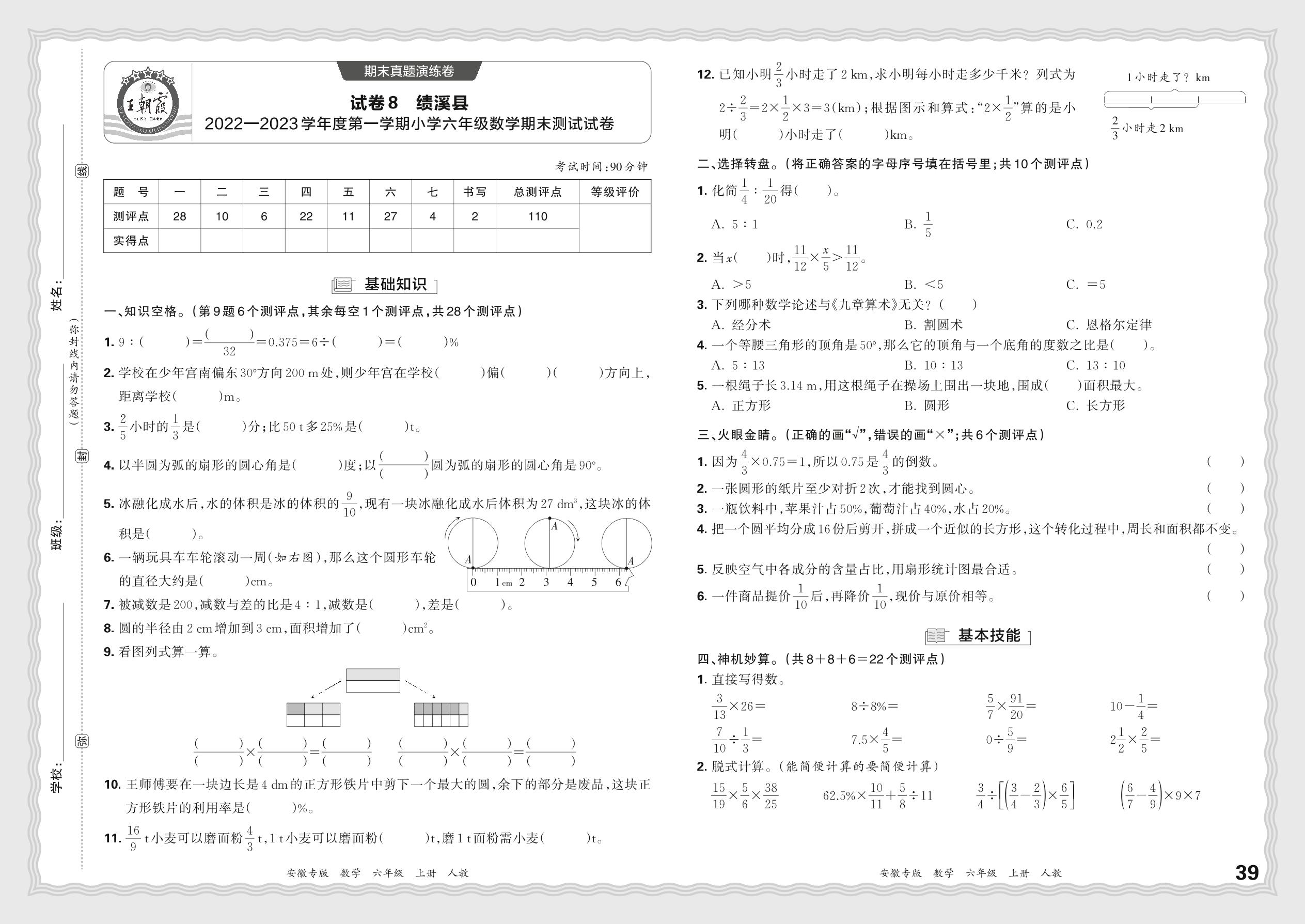 安徽省宣城市绩溪县2022—2023学年度第一学期小学六年级数学期末测试试卷(人教版)【8】