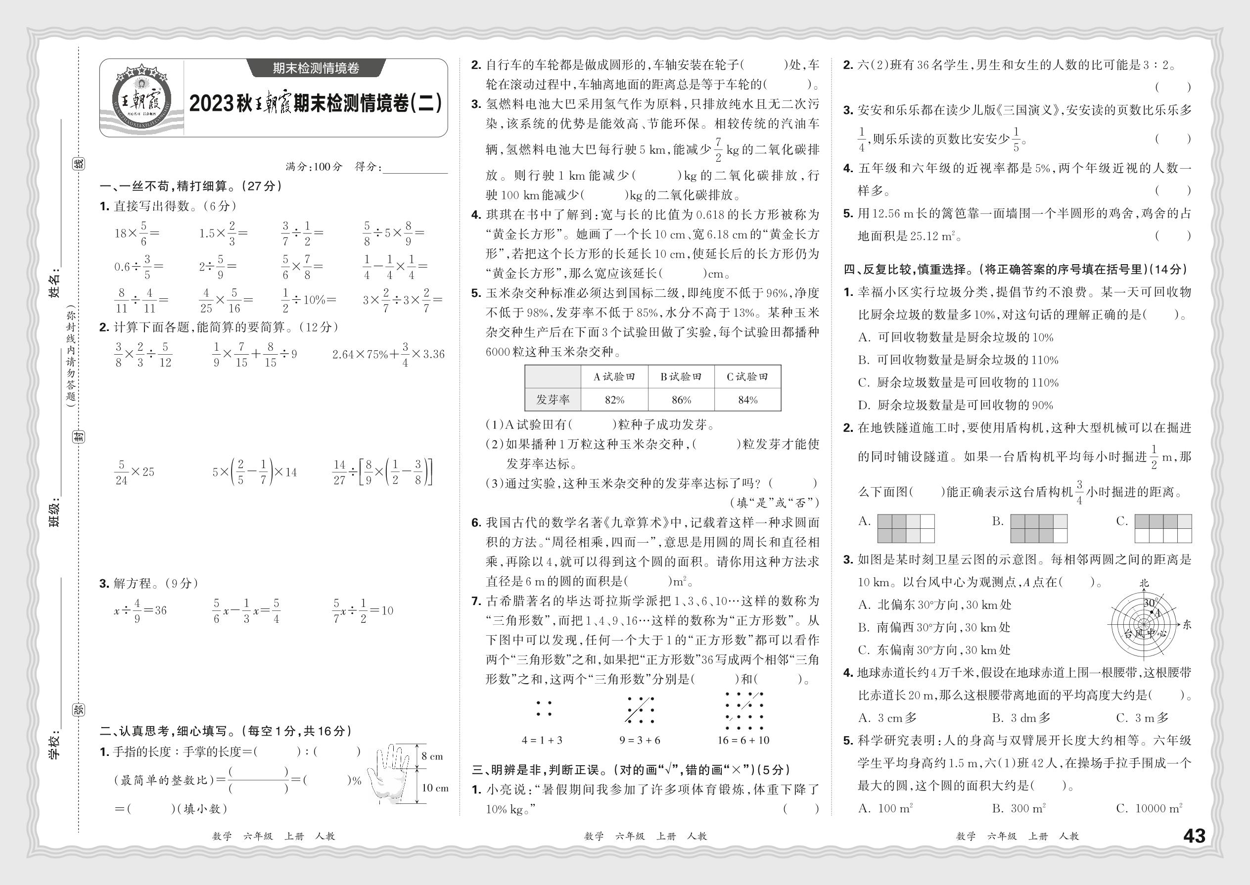 2023秋上册六年级数学人教版 王朝霞期末检测情境卷(二)