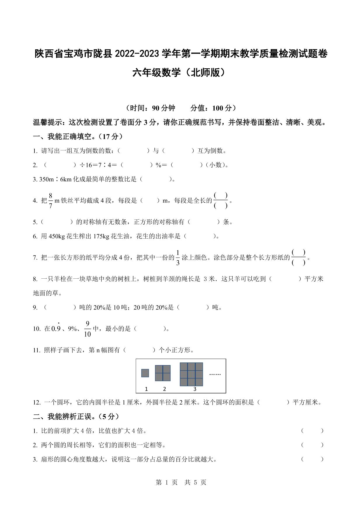 陕西省宝鸡市陇县2022-2023学年度第一学期期末教学质量检测试题卷六年级数学(北师版)