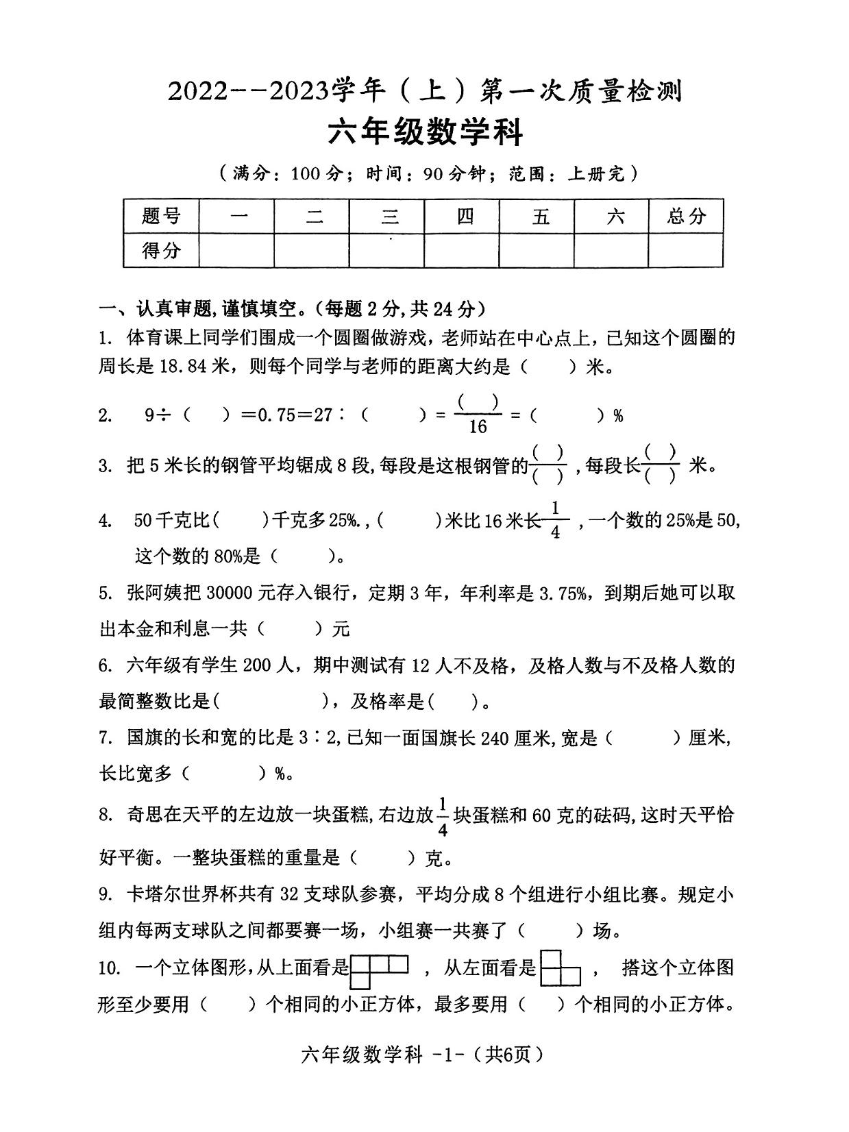陕西省咸阳市泾阳县2022-2023学年(上)第一次质量检测期末试题六年级数学(北师版)