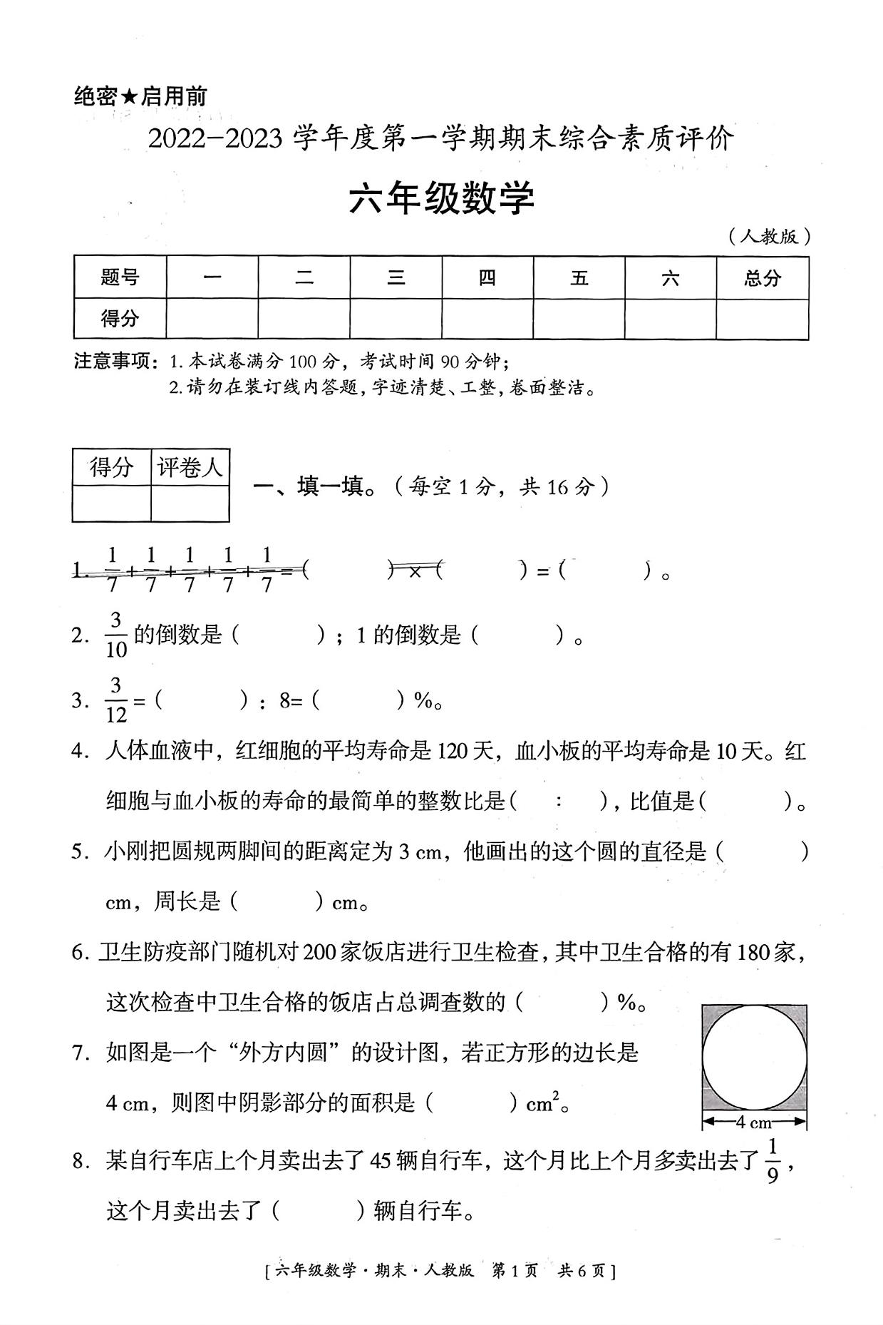 陕西省延安市富县2022-2023学年度第一学期期末综合素质评价六年级数学(人教版)