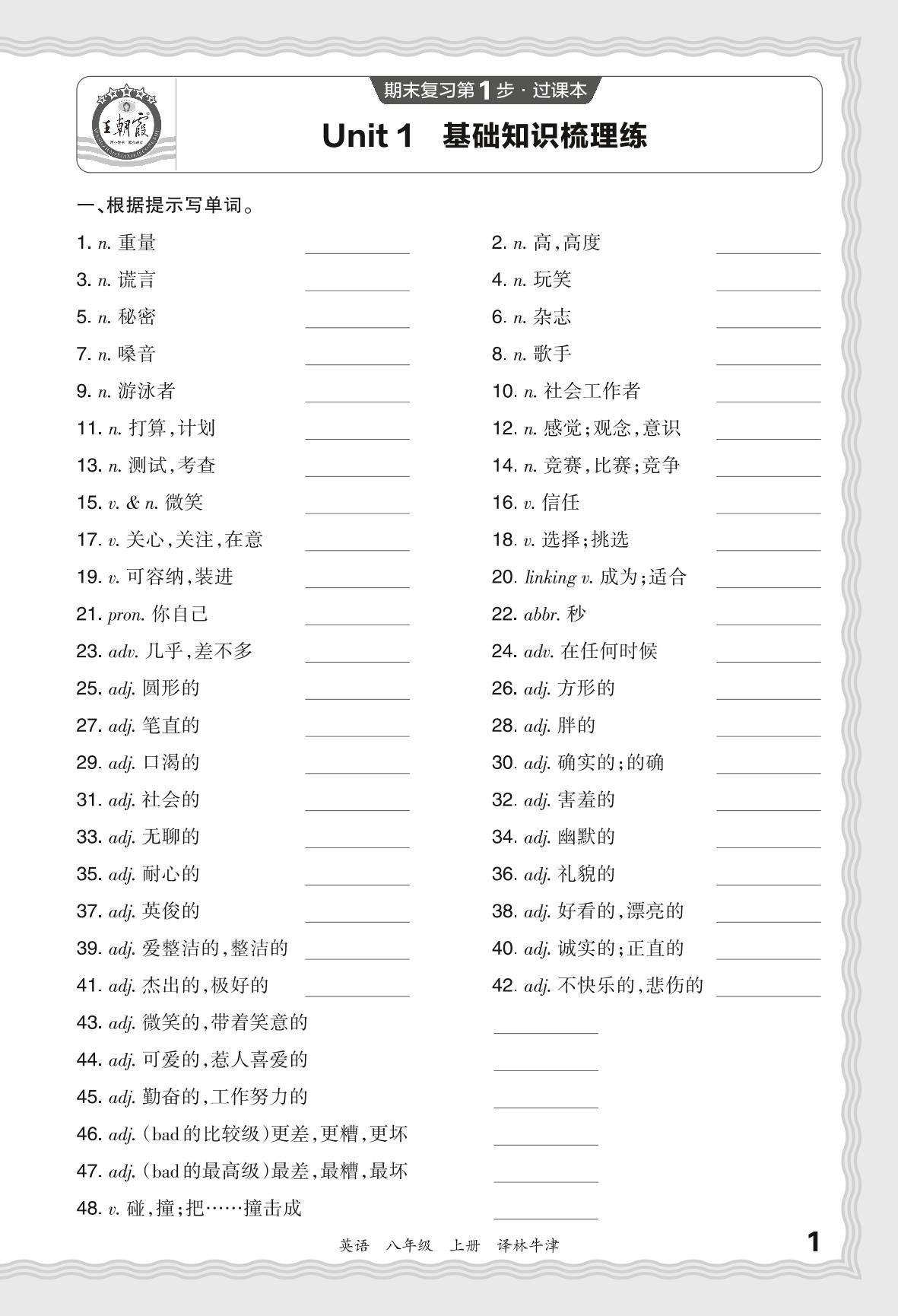 2023秋上册八年级英语译林牛津版 期末过课本·Unit 1 基础知识梳理练