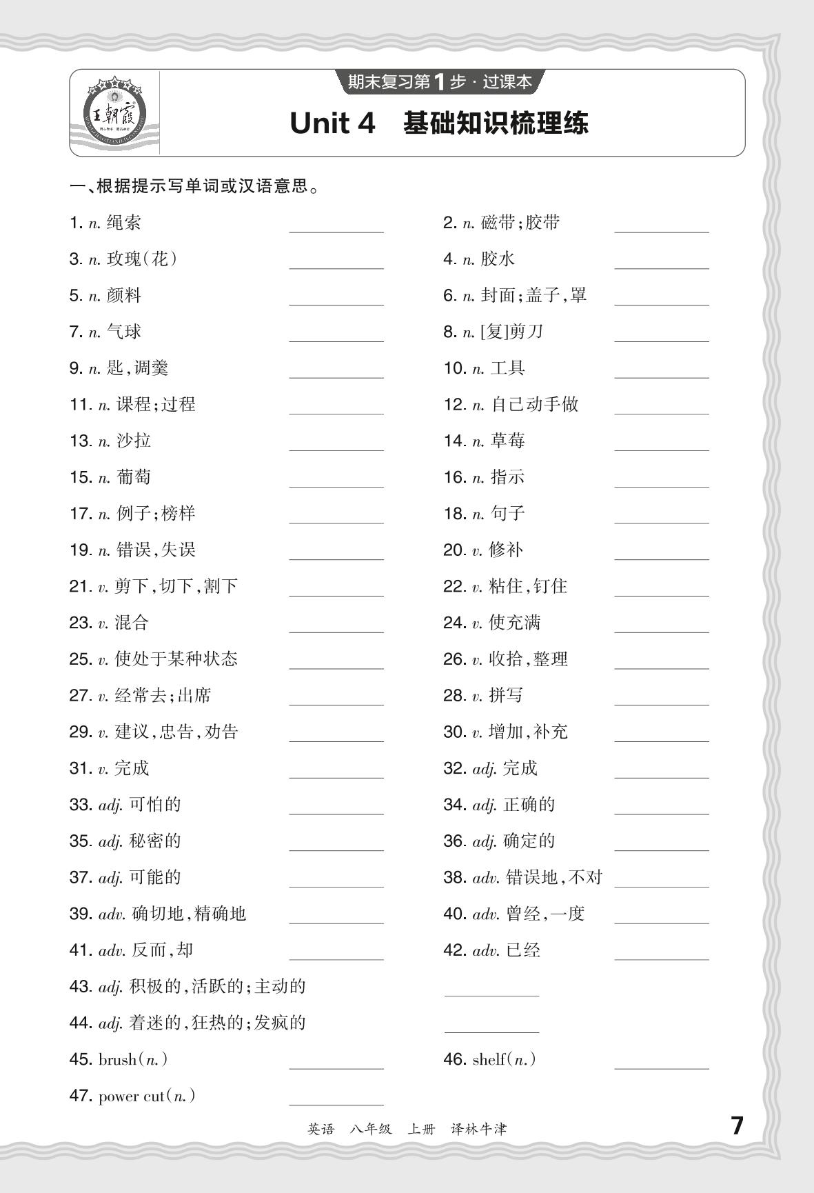 2023秋上册八年级英语译林牛津版 期末过课本·Unit 4 基础知识梳理练