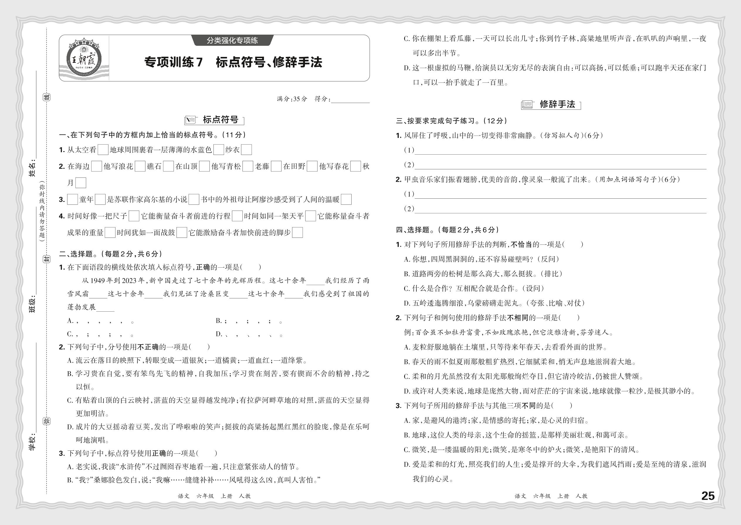 2023秋上册六年级语文人教版 期末专项·标点符号、修辞手法【7】