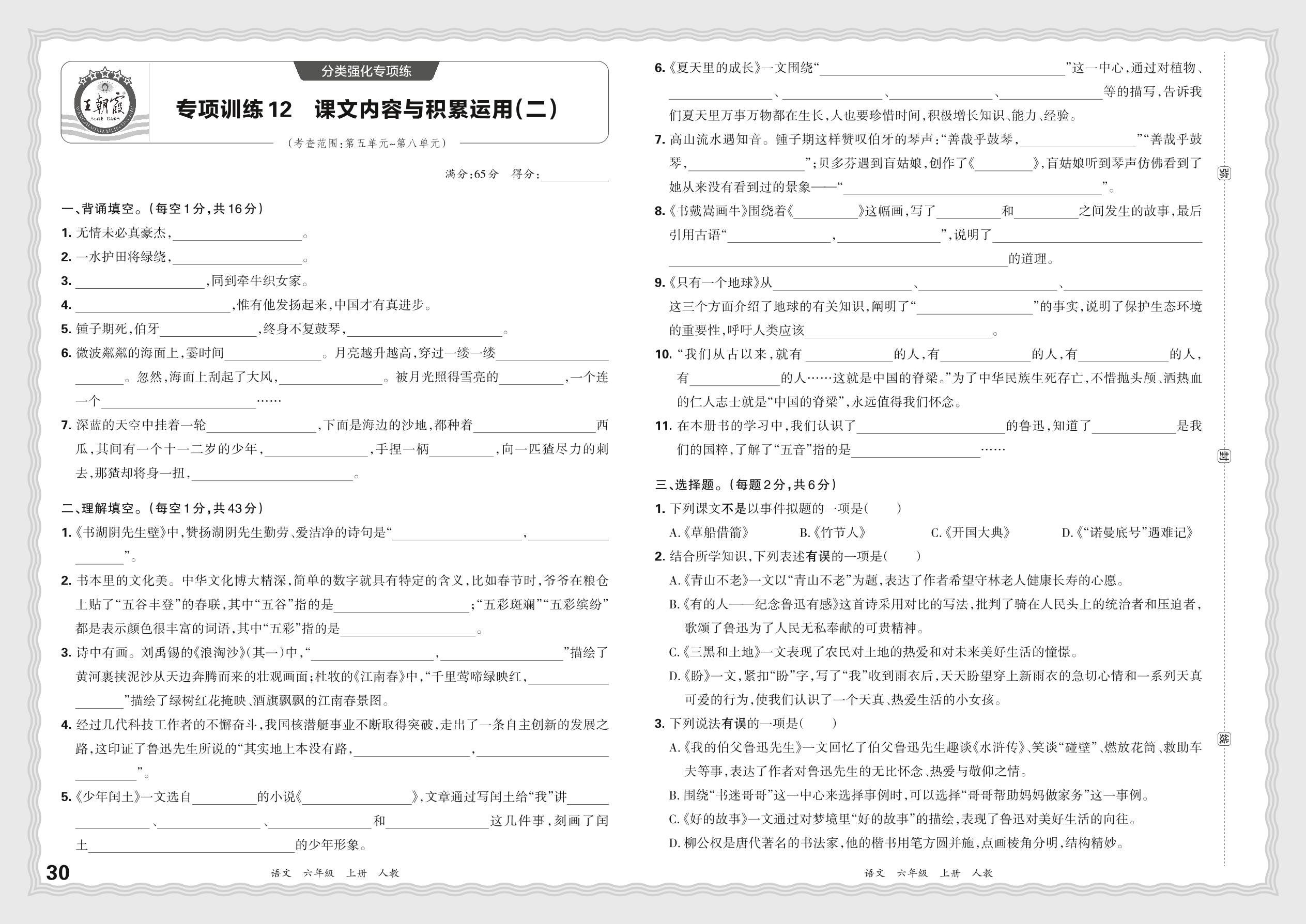 2023秋上册六年级语文人教版 期末专项·课文内容与积累运用(二)【12】