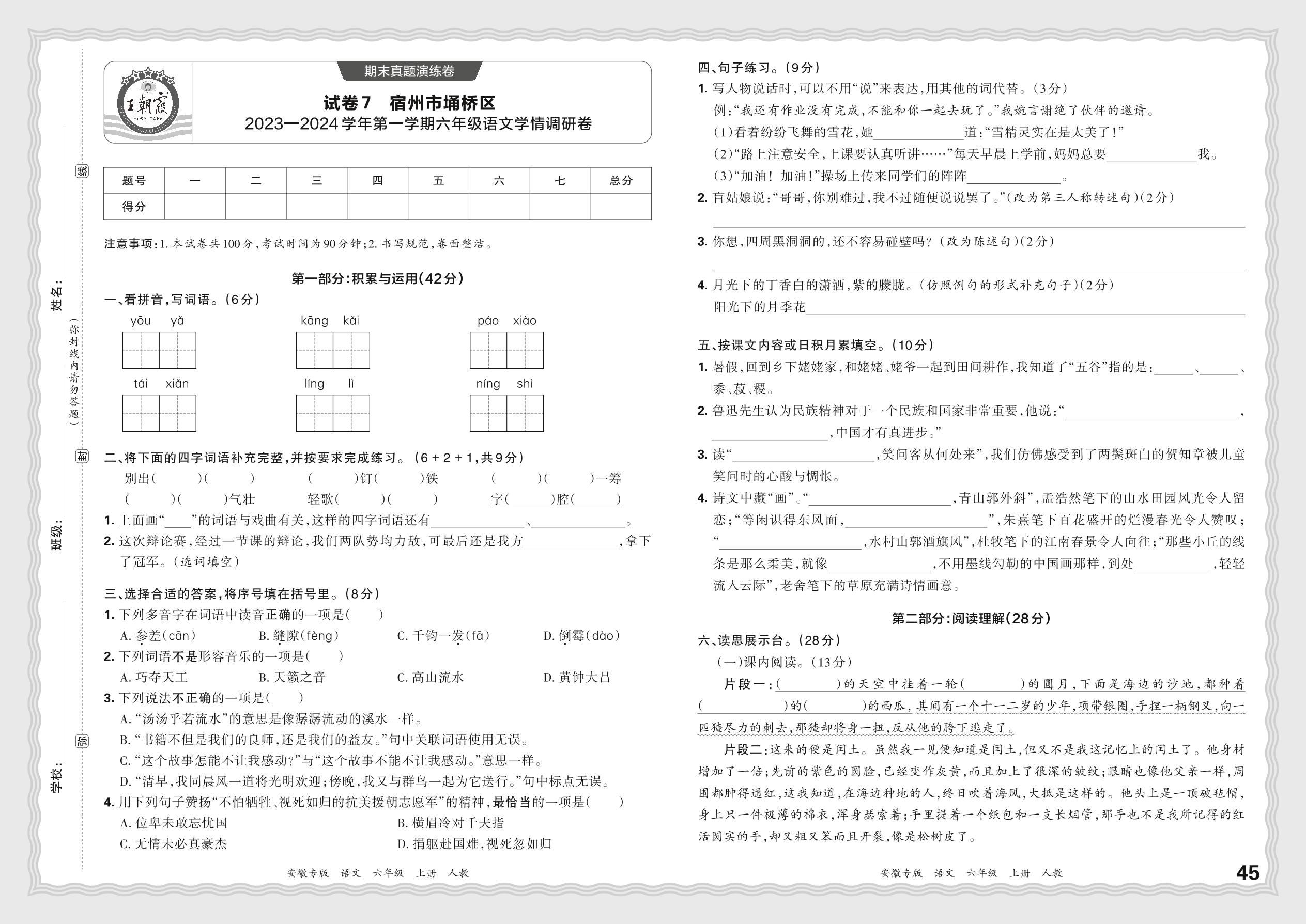 安徽省宿州市埇桥区2023—2024学年第一学期六年级语文学情调研卷(人教版)【7】