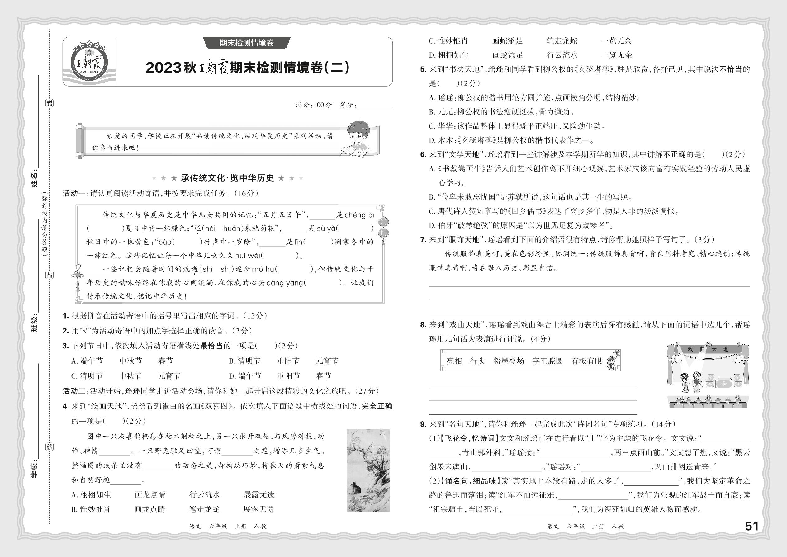 2023秋上册六年级语文人教版 王朝霞期末检测情境卷(二)