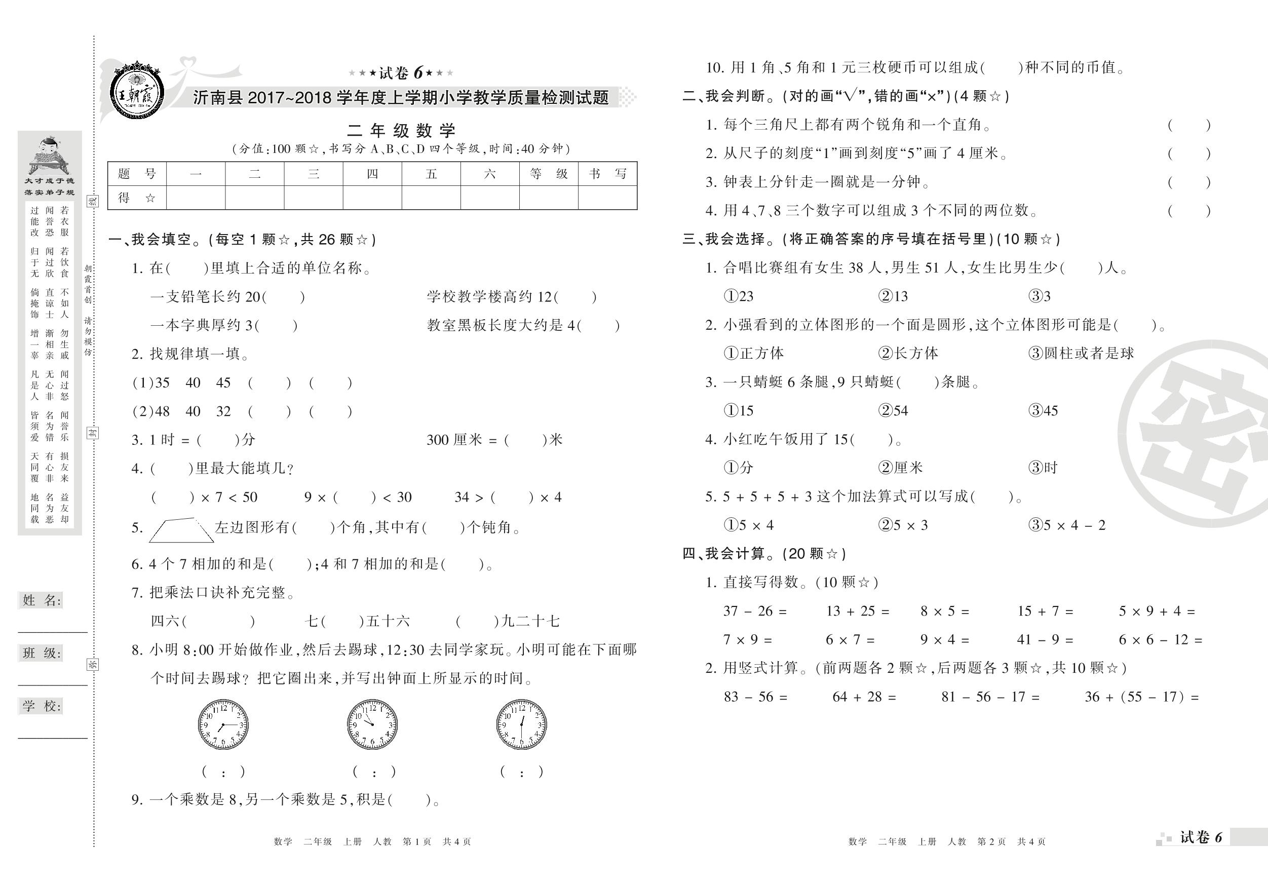 2017-2018学年第一学期临沂市沂南县二年级数学试卷(人教版)【6】