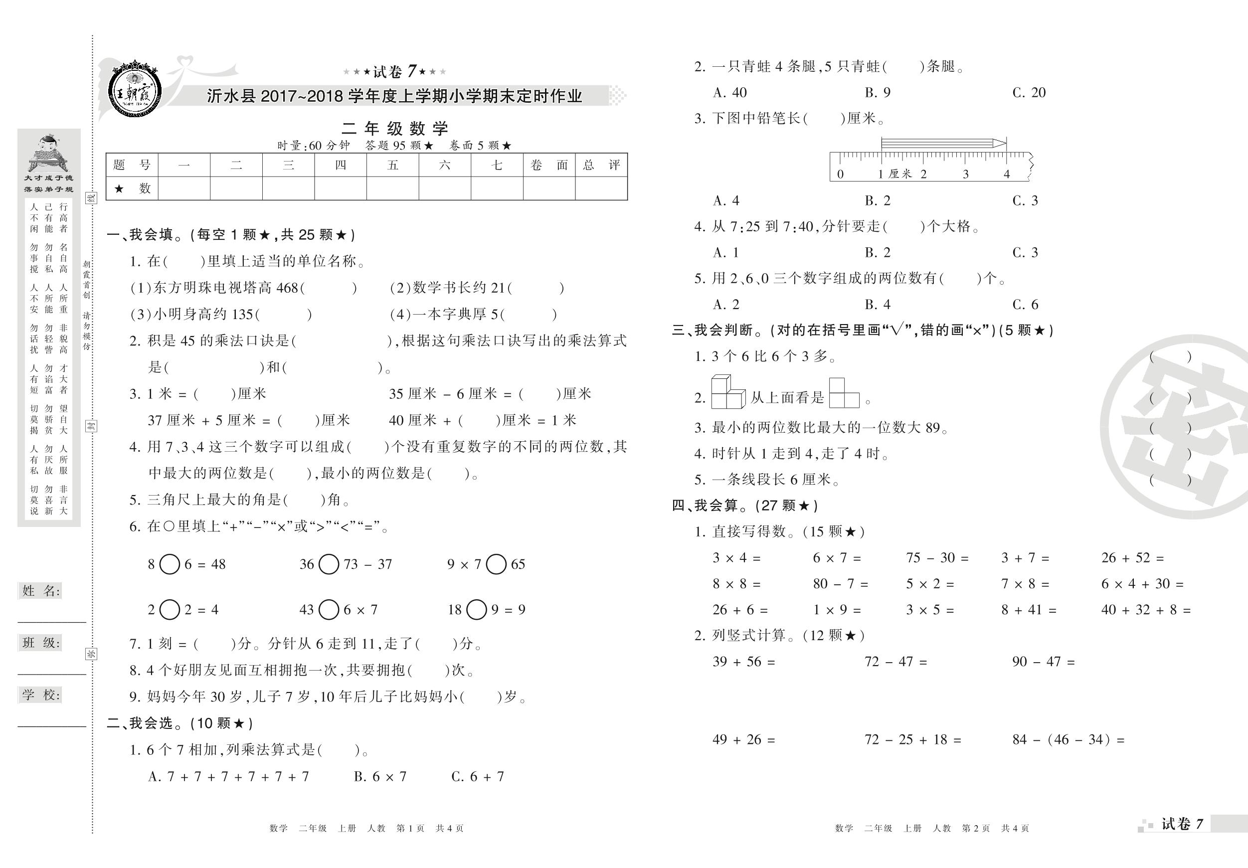 2017-2018学年第一学期临沂市沂水县二年级数学试卷(人教版)【7】