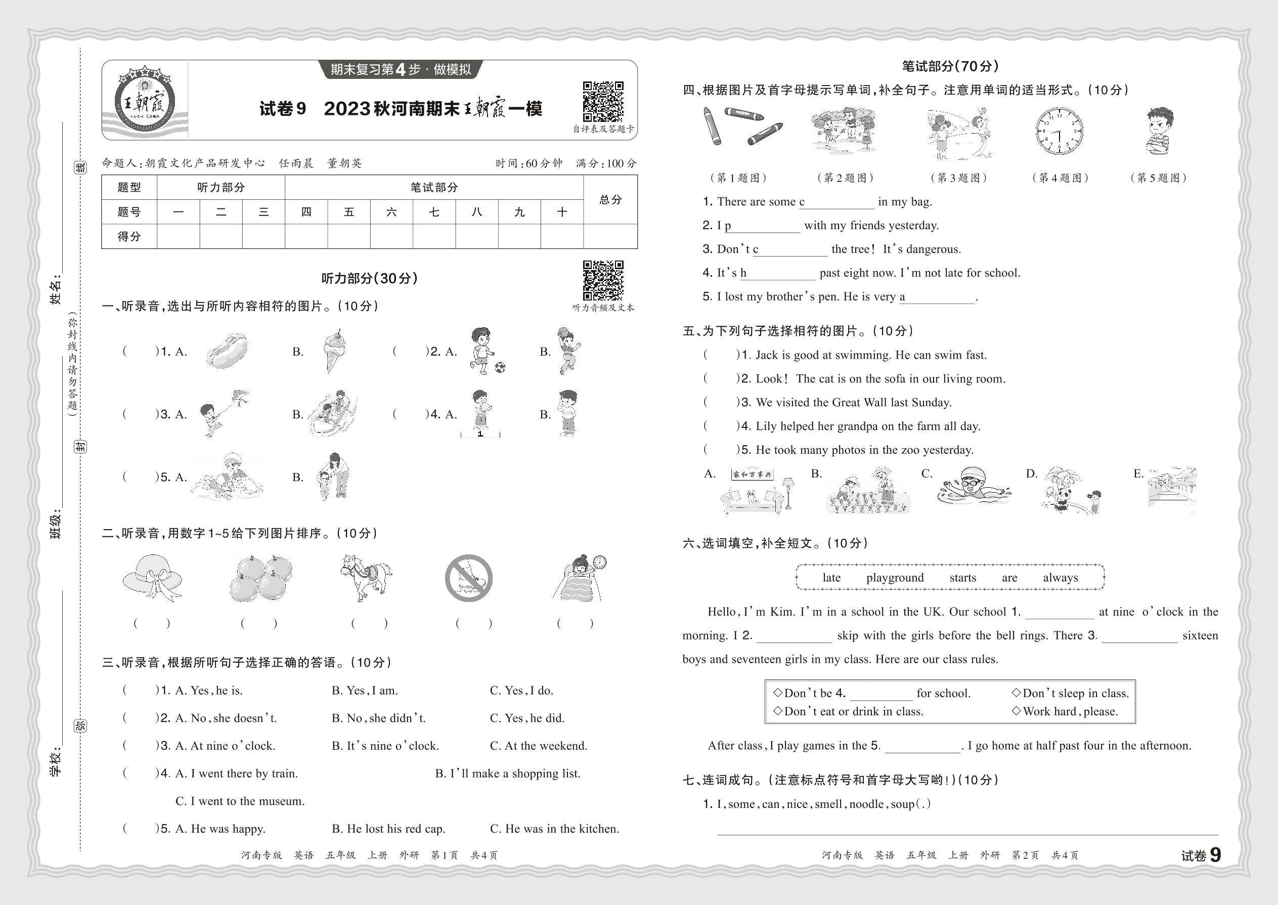 2023秋上册五年级英语外研版 河南期末王朝霞一模【9】