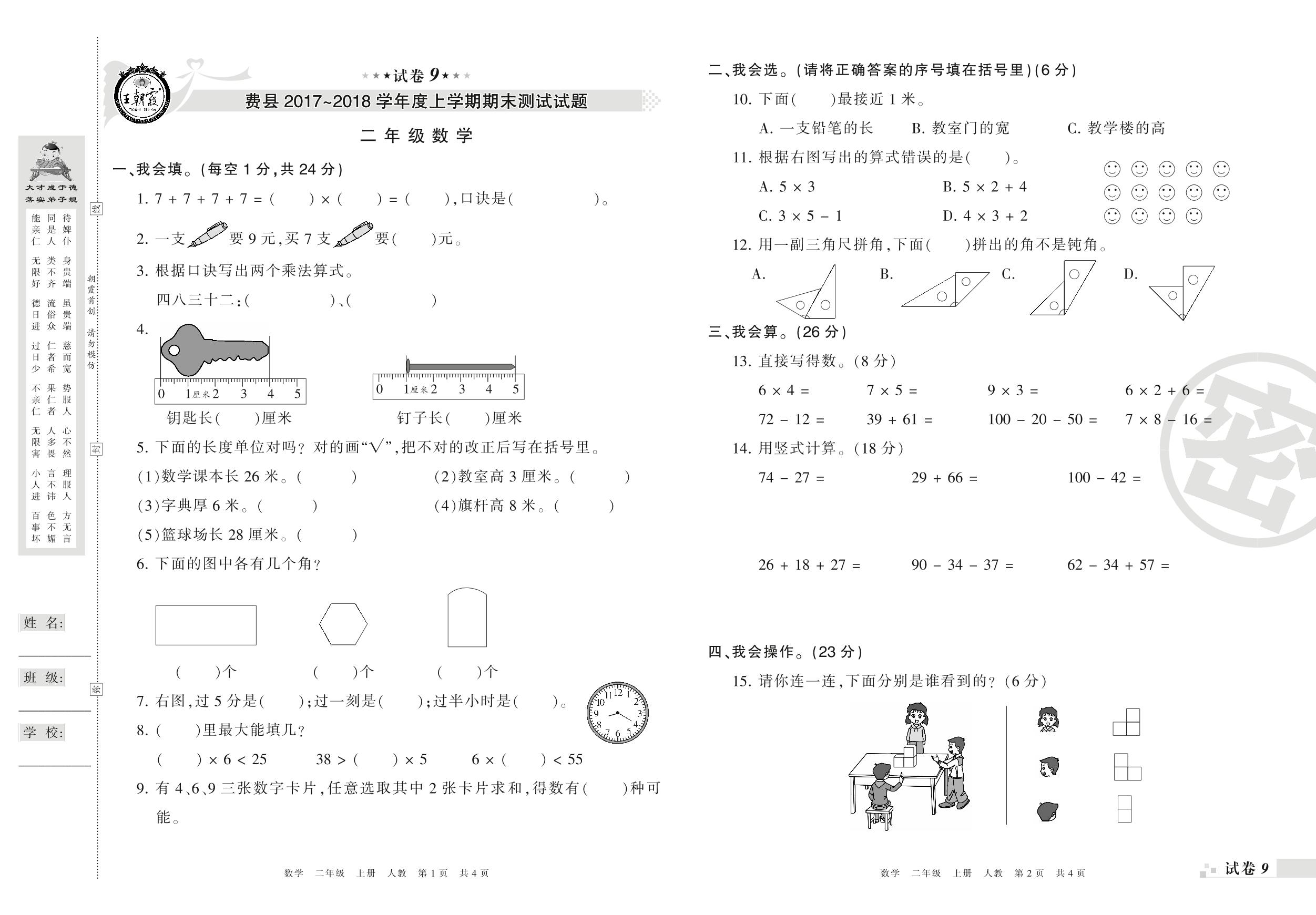 2017-2018学年第一学期临沂市费县二年级数学试卷(人教版)【9】