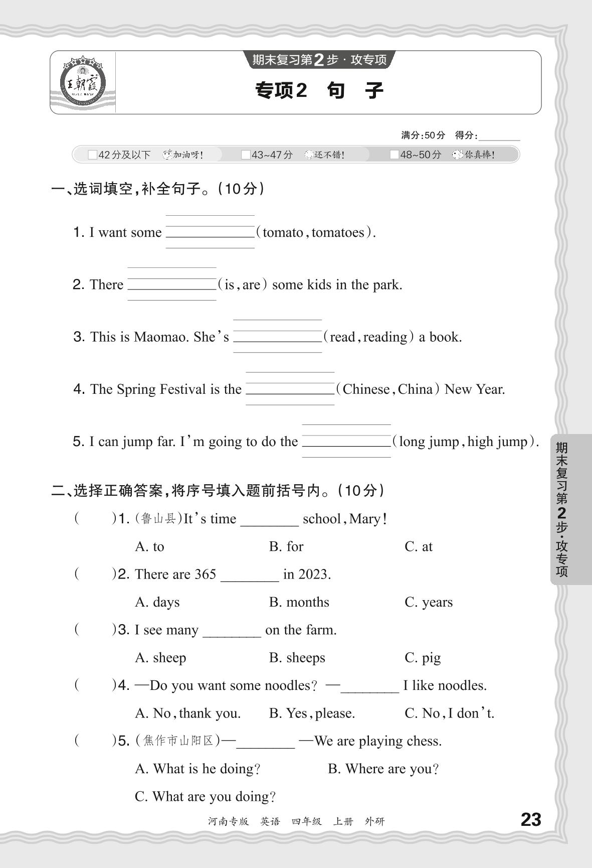 2023秋上册四年级英语外研版 期末专项卷·句子【2】