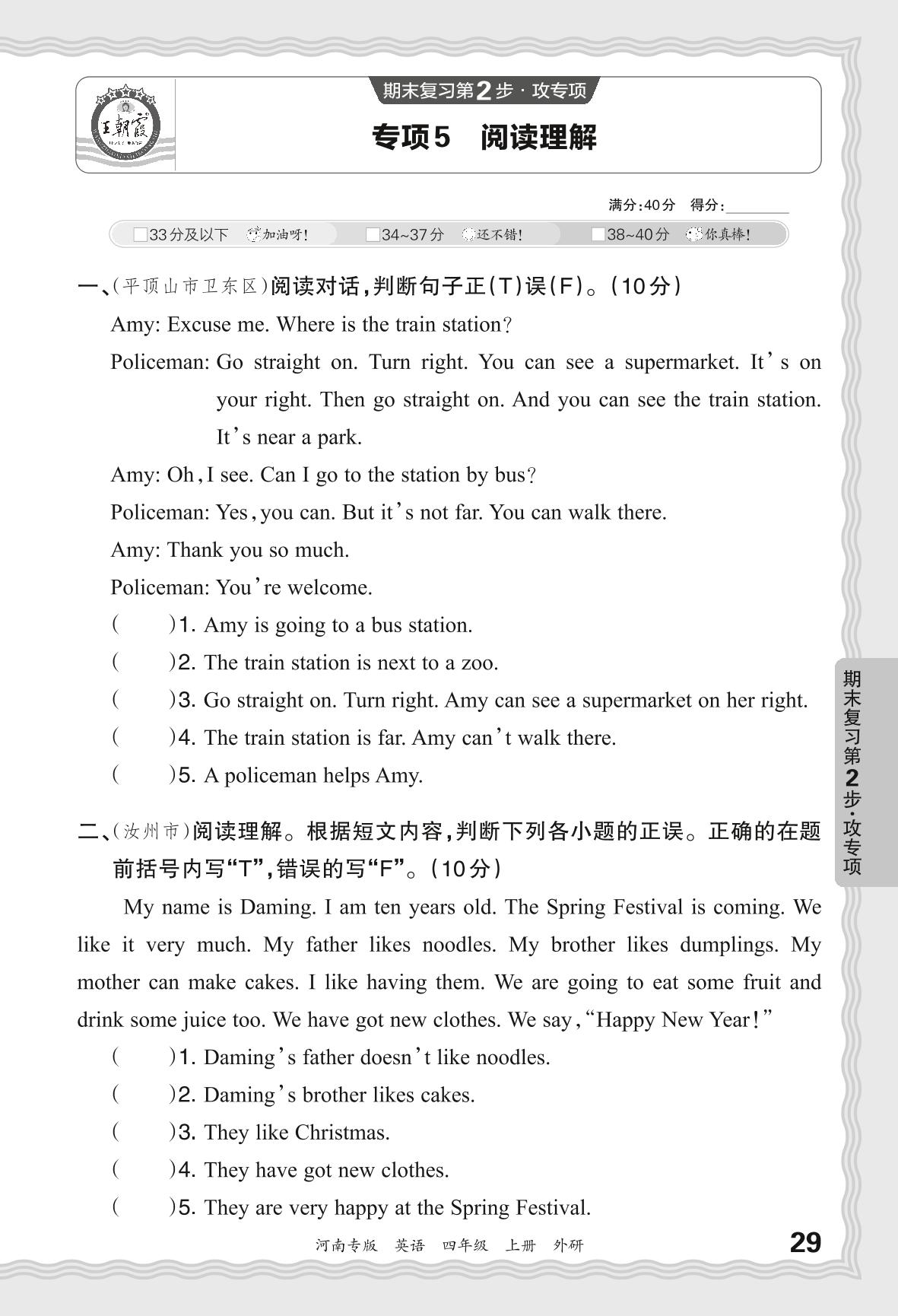 2023秋上册四年级英语外研版 期末专项卷·阅读理解【5】