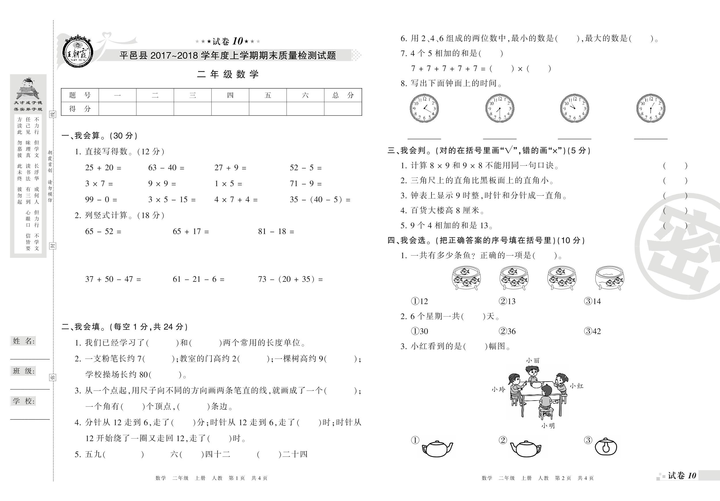 2017-2018学年第一学期临沂市平邑县二年级数学试卷(人教版)【10】