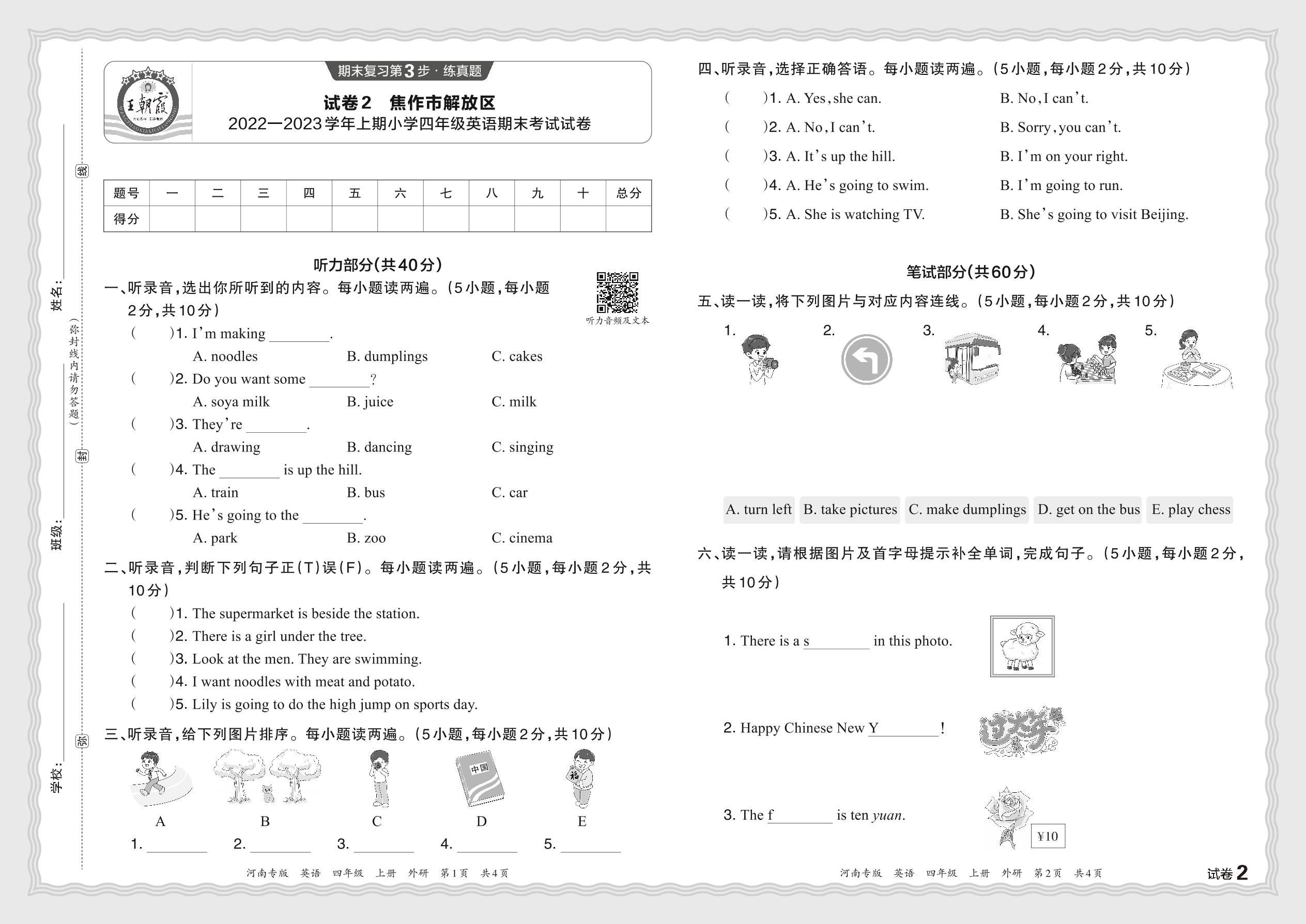 河南省焦作市解放区2022—2023学年上期小学四年级英语期末考试试卷(外研版)【2】