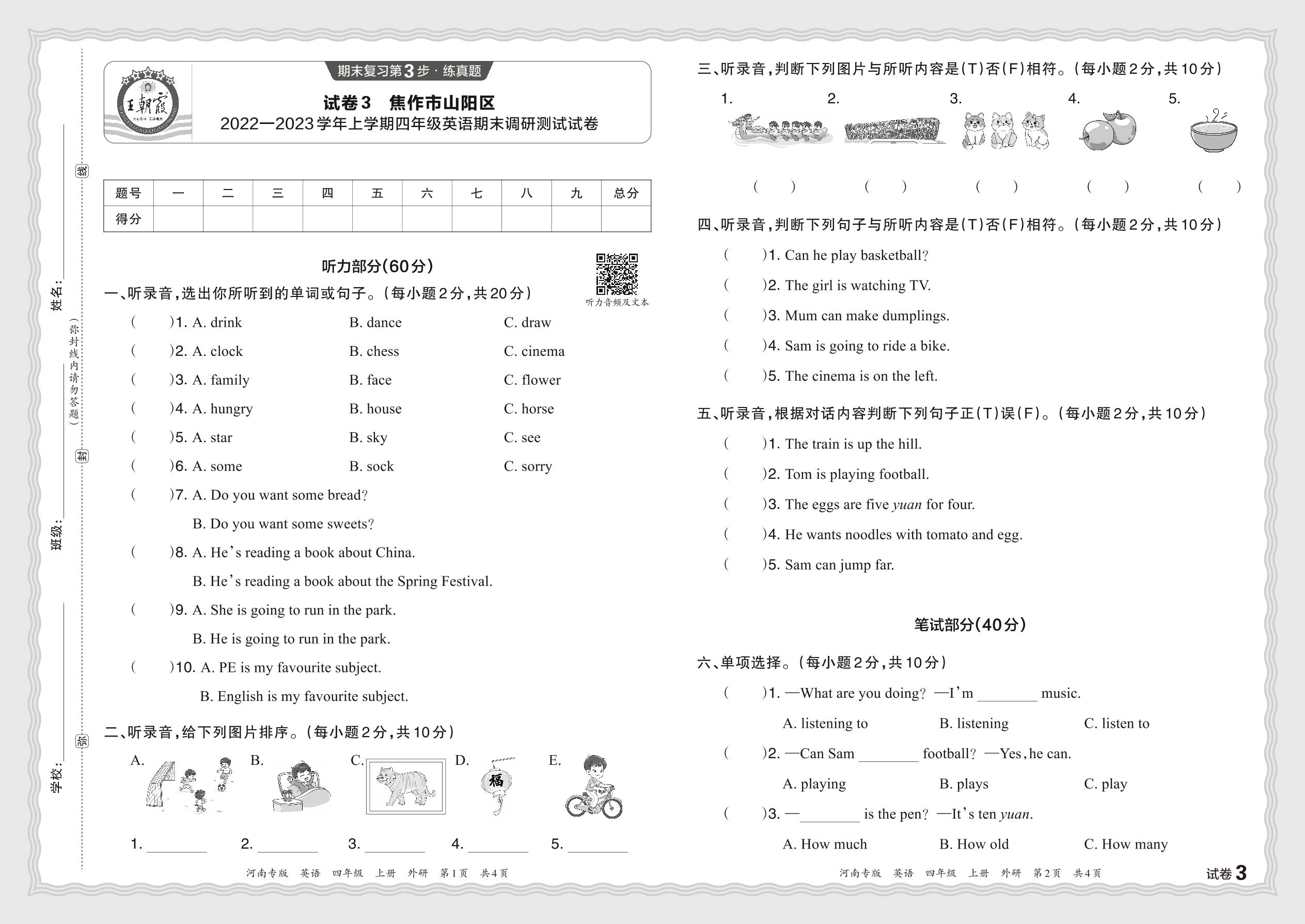 河南省焦作市山阳区2022—2023学年上学期四年级英语期末调研测试试卷(外研版)【3】