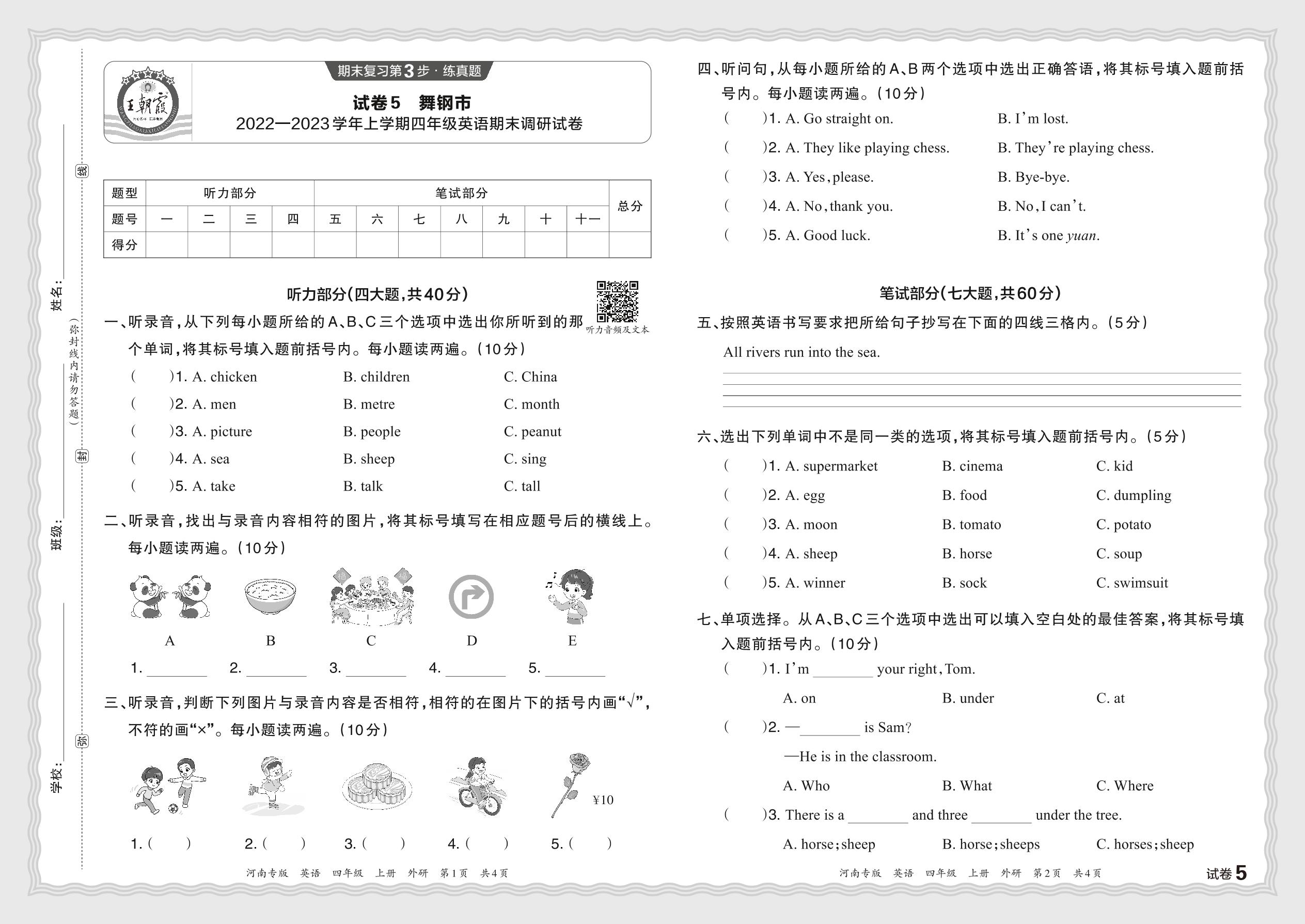 河南省平顶山市舞钢市2022—2023学年上学期四年级英语期末调研试卷(外研版)【5】