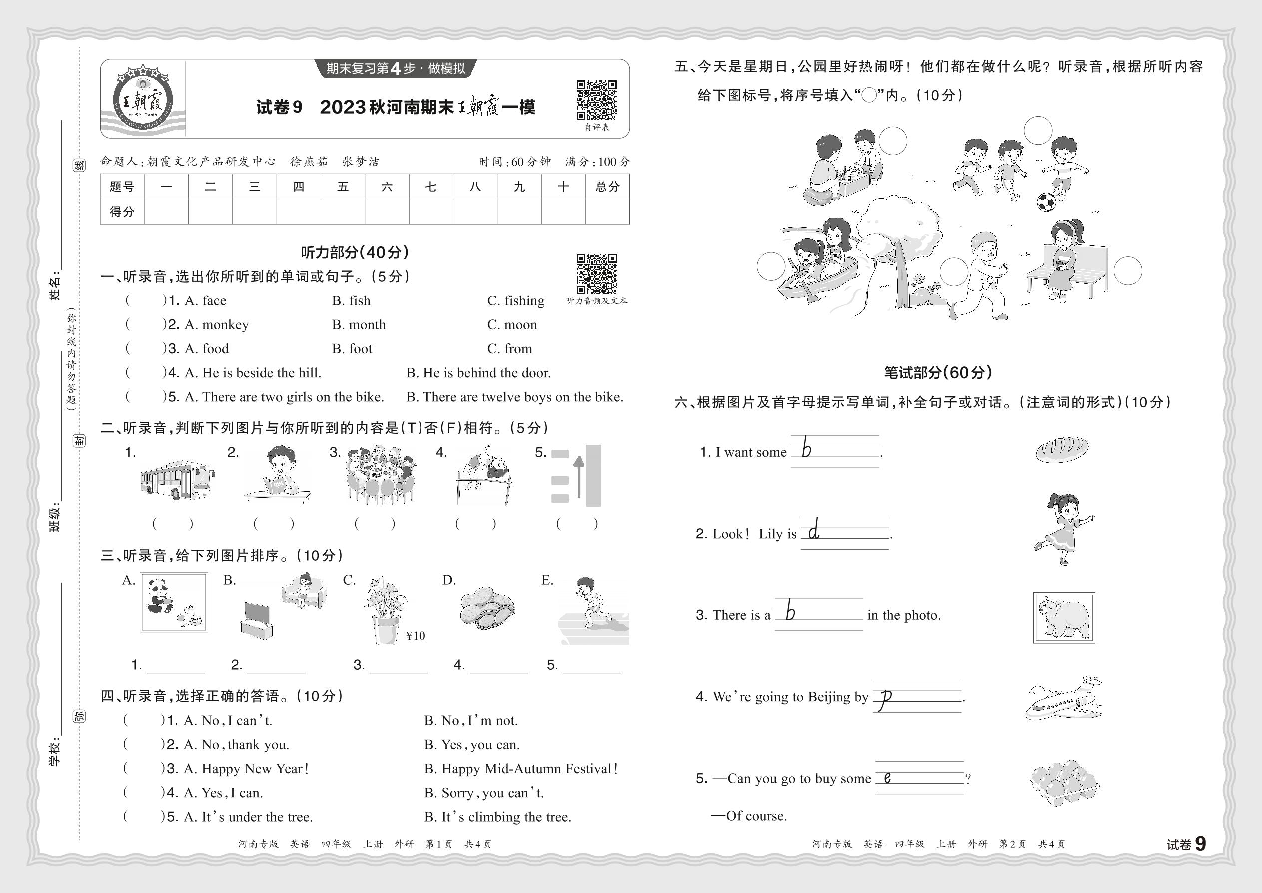 2023秋上册四年级英语外研版 河南期末王朝霞一模【9】