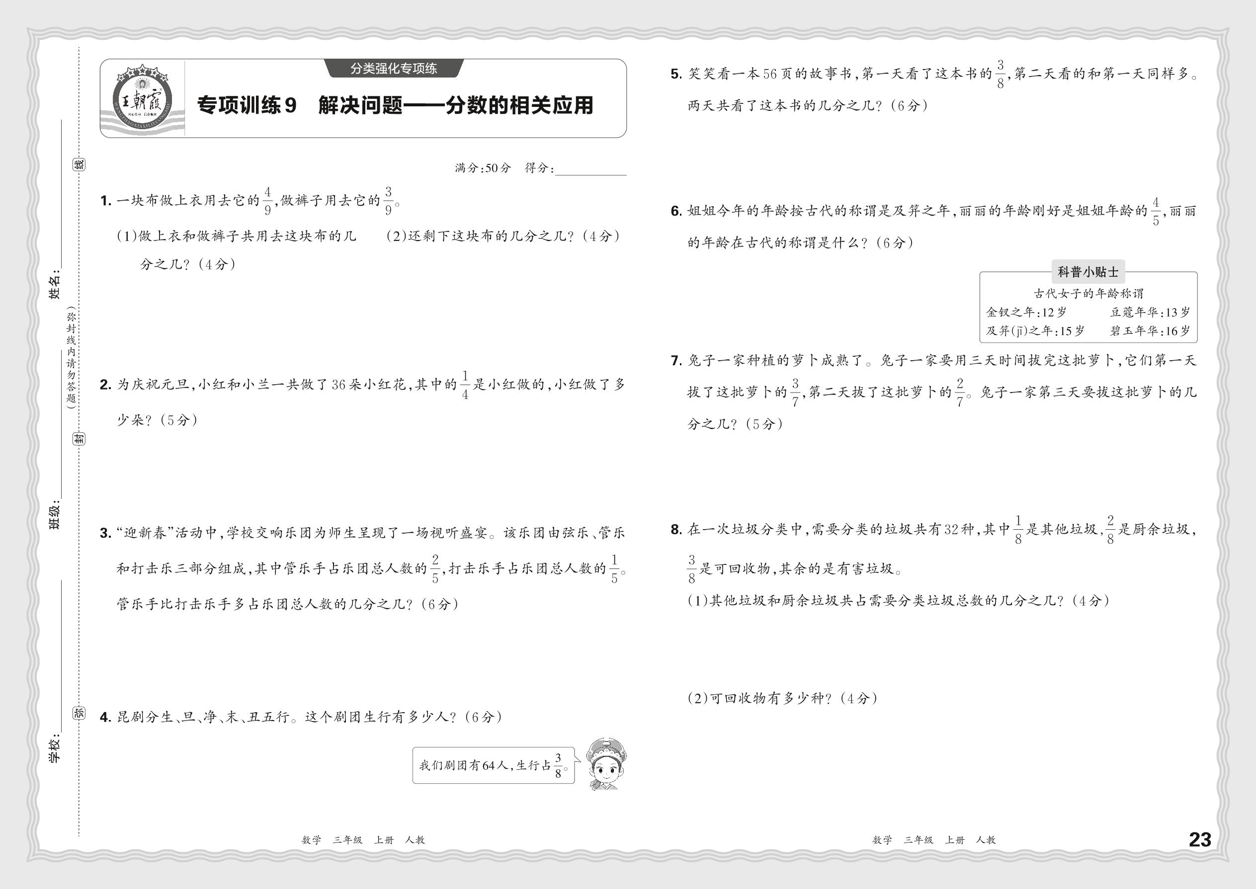 2023秋上册三年级数学人教版 期末专项·解决问题——分数的相关应用【9】