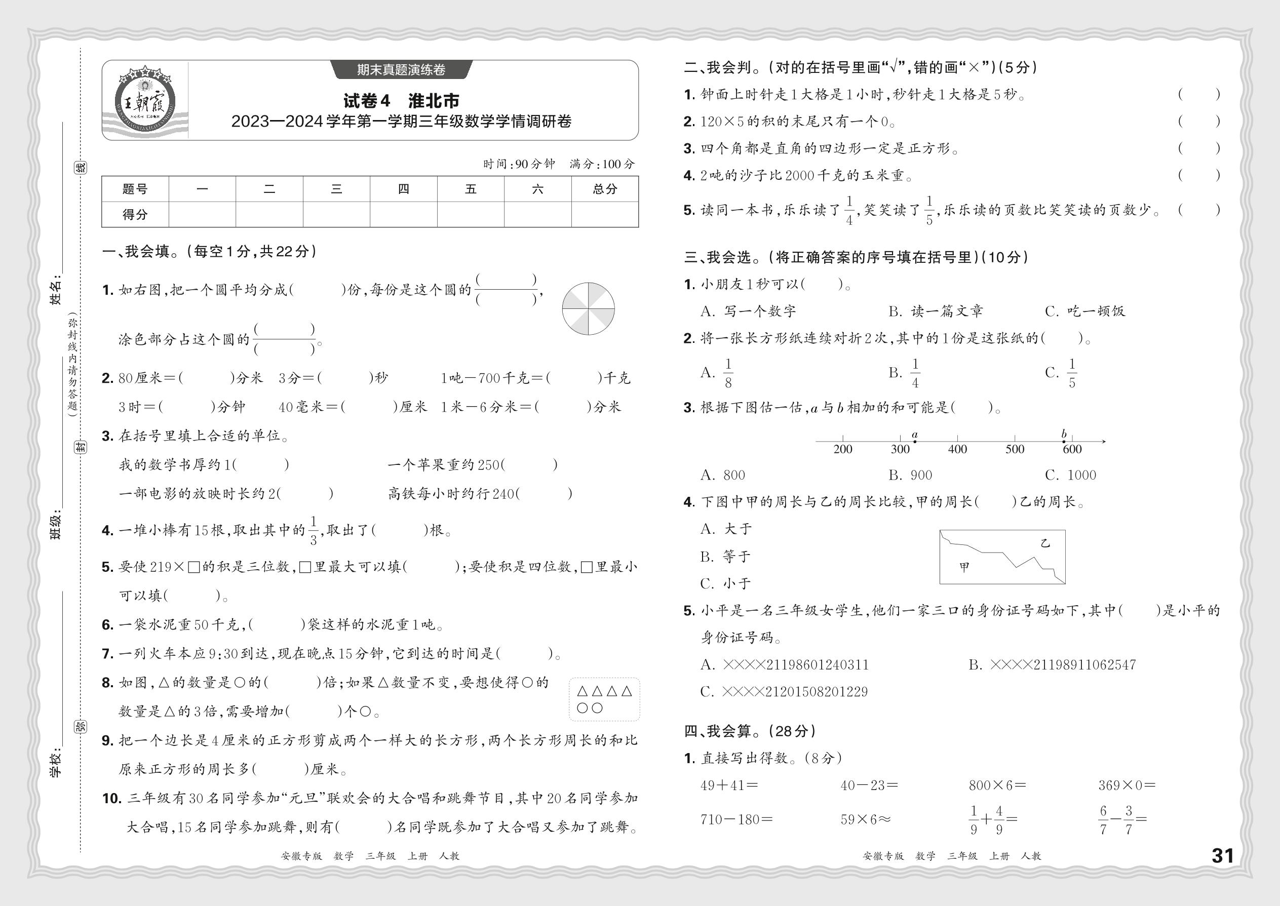 安徽省淮北市2023—2024学年第一学期三年级数学学情调研卷(人教版)【4】