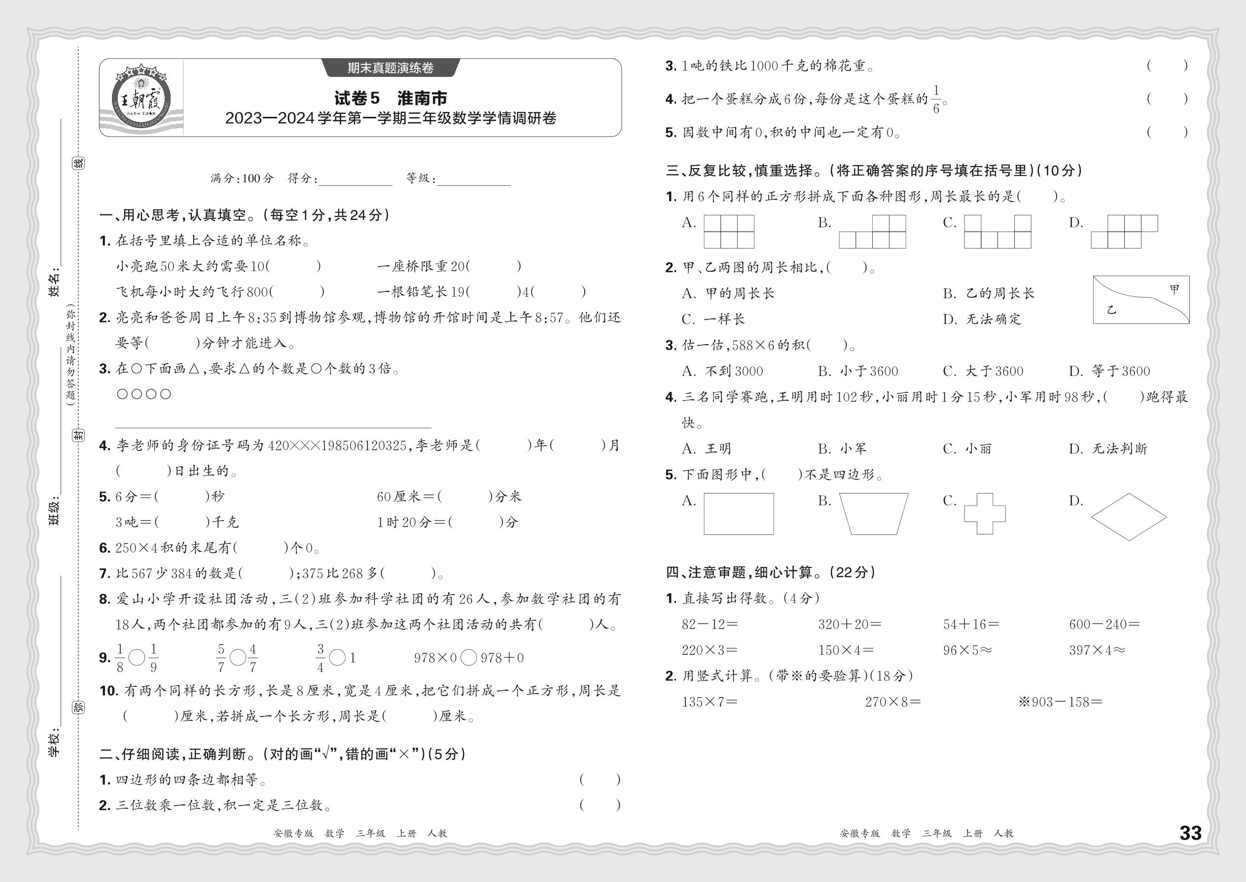 安徽省淮南市2023—2024学年第一学期三年级数学学情调研卷(人教版)【5】