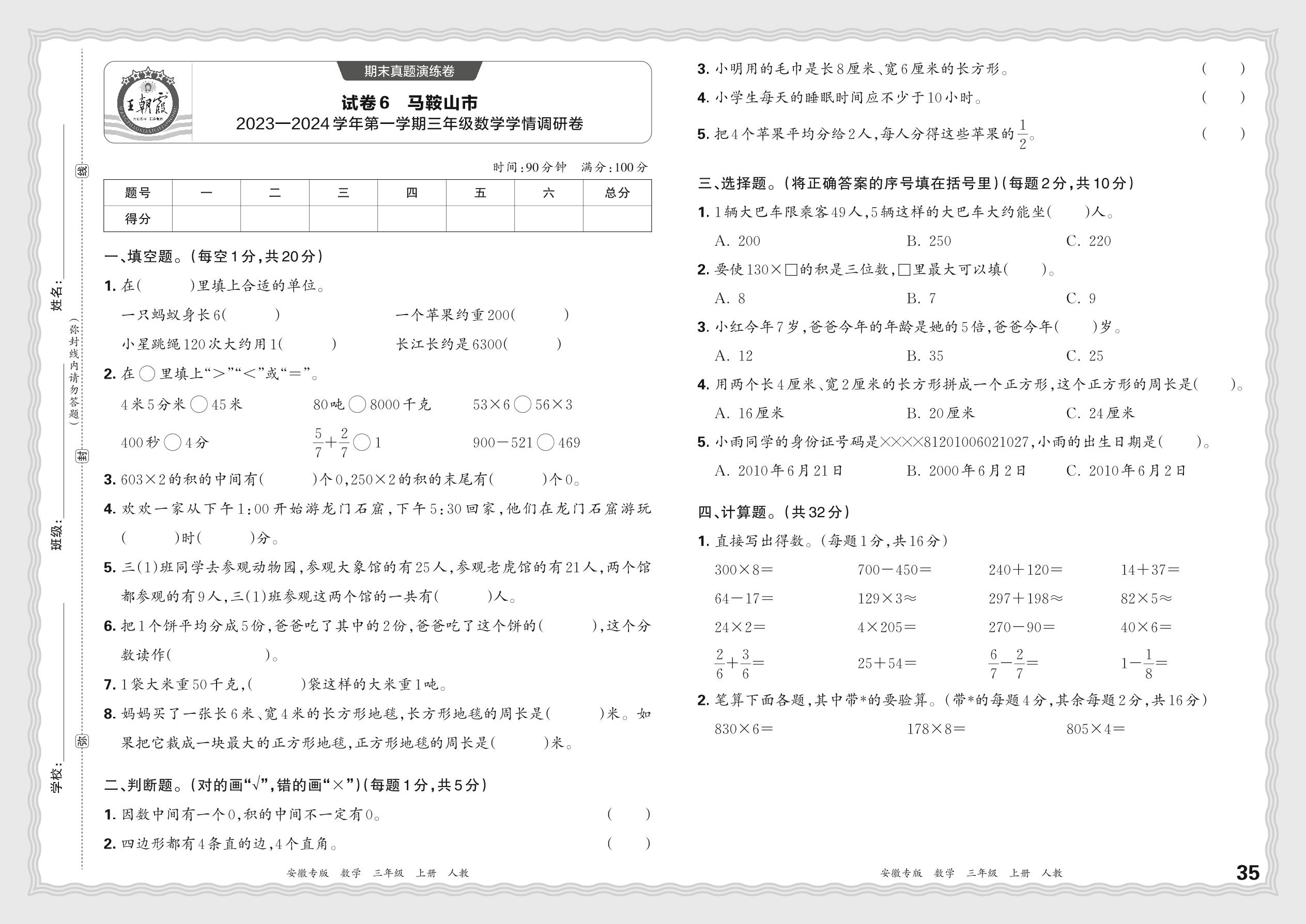 安徽省马鞍山市2023—2024学年第一学期三年级数学学情调研卷(人教版)【6】