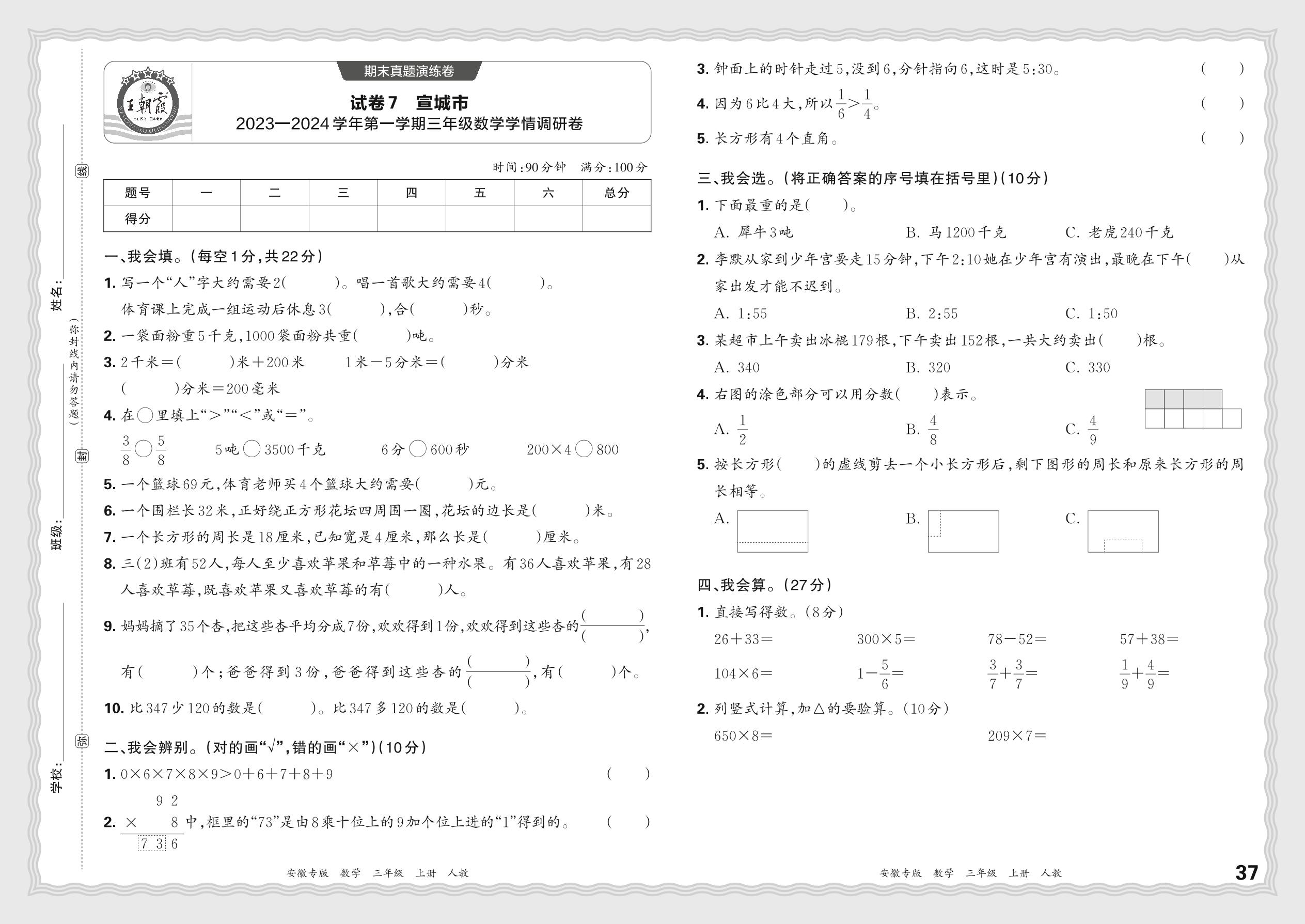 安徽省宣城市2023—2024学年第一学期三年级数学学情调研卷(人教版)【7】
