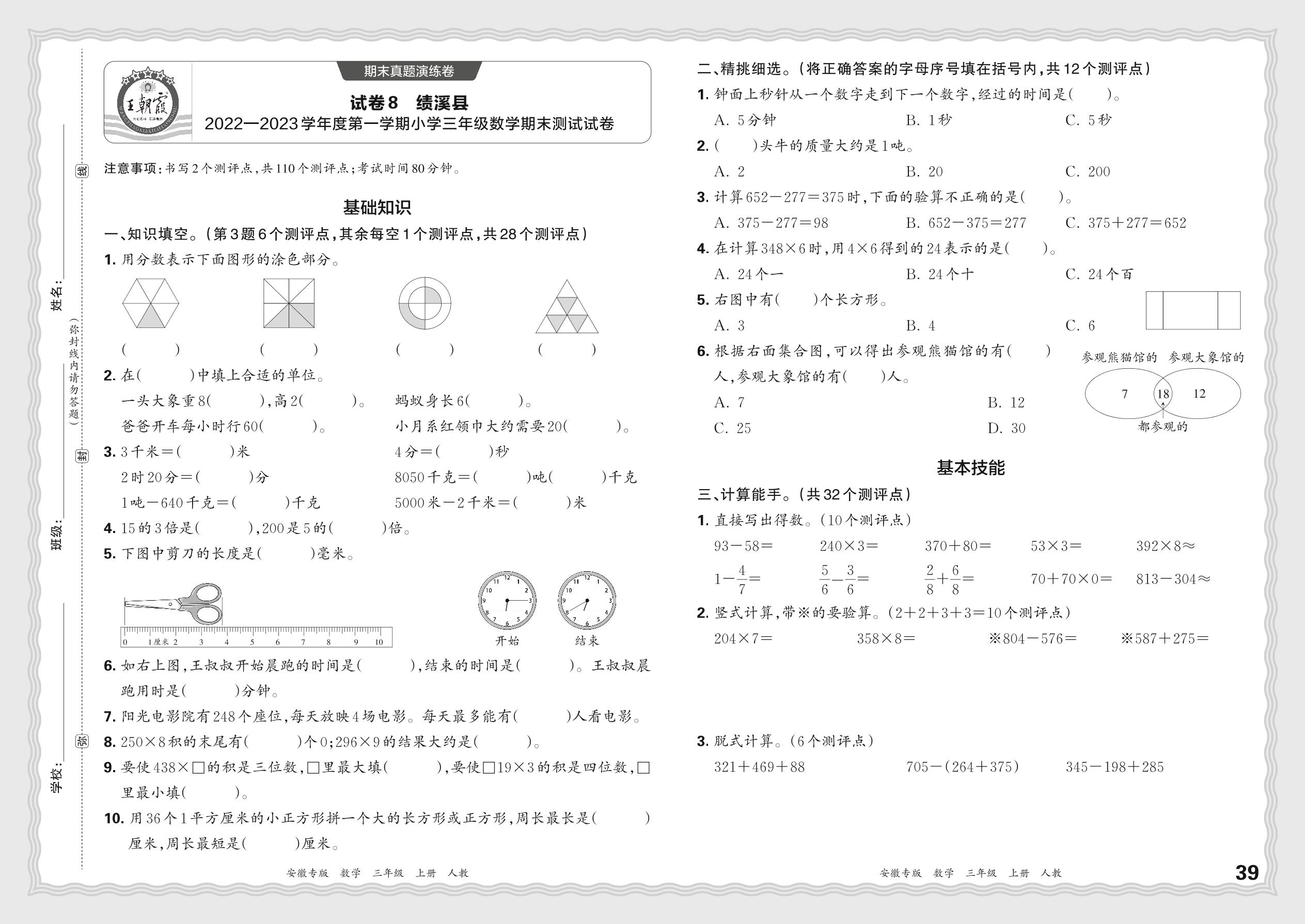 安徽省宣城市绩溪县2022—2023学年度第一学期小学三年级数学期末测试试卷(人教版)【8】