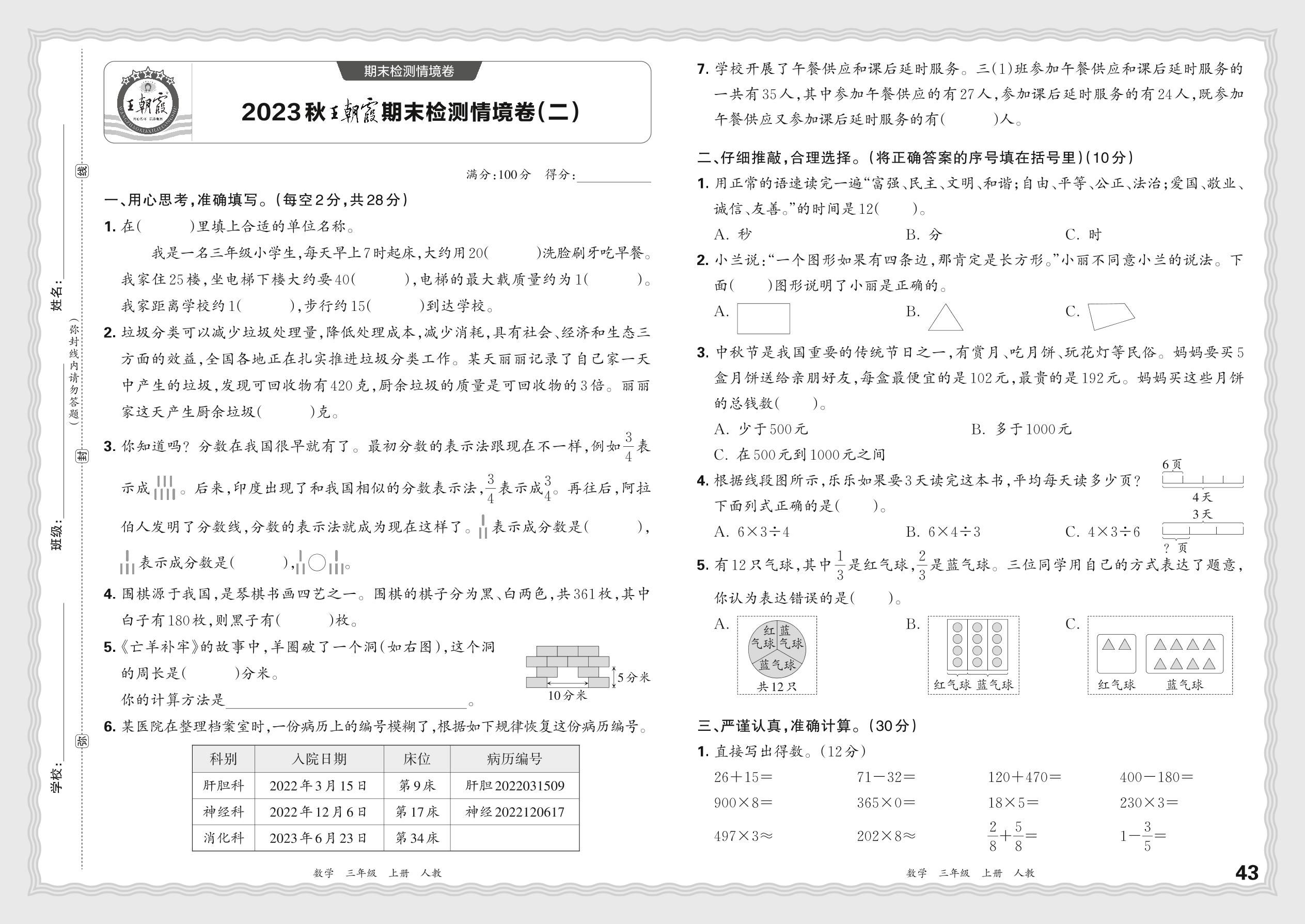 2023秋上册三年级数学人教版 王朝霞期末检测情境卷(二)