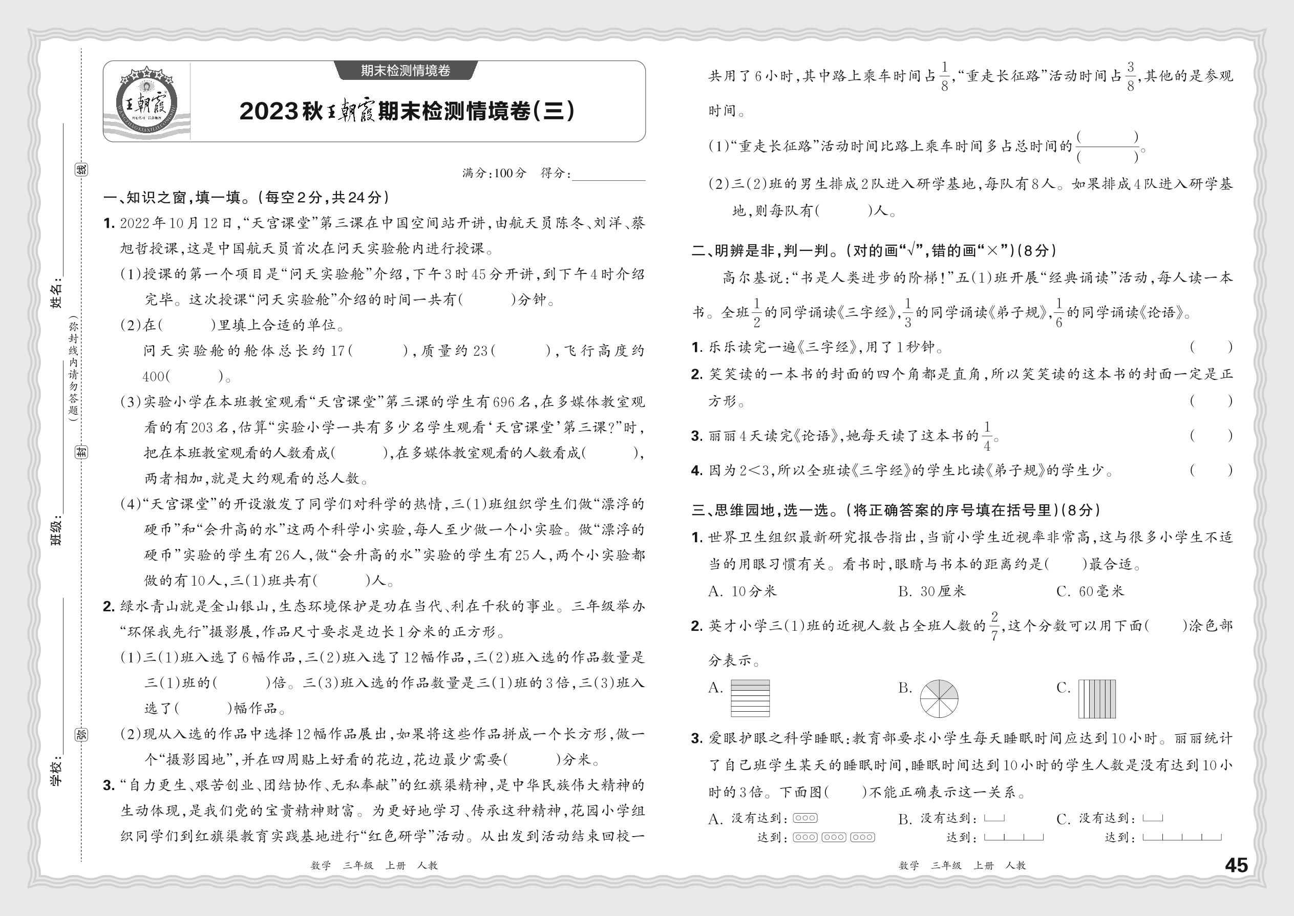 2023秋上册三年级数学人教版 王朝霞期末检测情境卷(三)