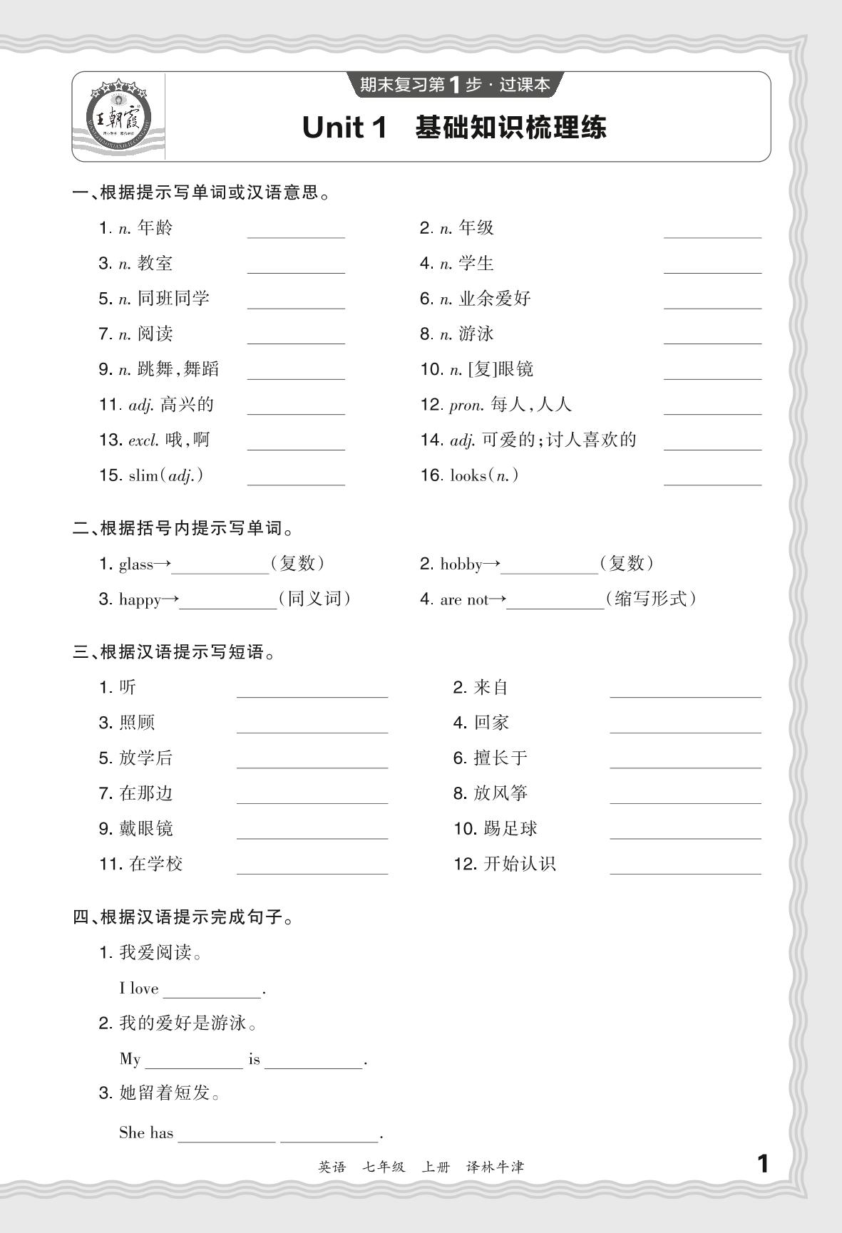2023秋上册七年级英语译林牛津版 期末过课本·Unit 1 基础知识梳理练