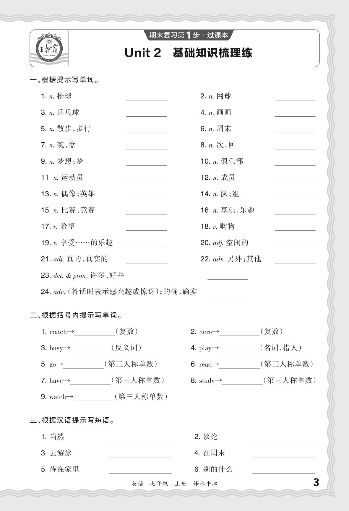2023秋上册七年级英语译林牛津版 期末过课本·Unit 2 基础知识梳理练