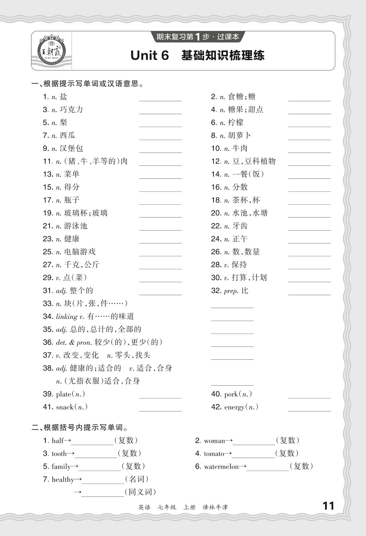 2023秋上册七年级英语译林牛津版 期末过课本·Unit 6 基础知识梳理练