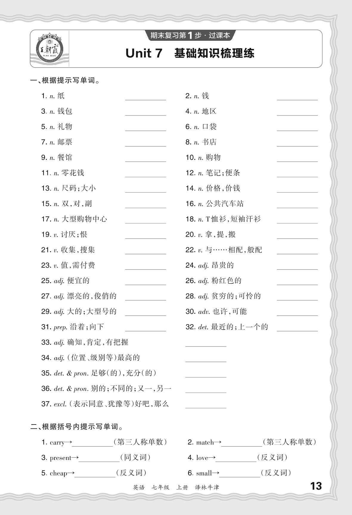 2023秋上册七年级英语译林牛津版 期末过课本·Unit 7 基础知识梳理练