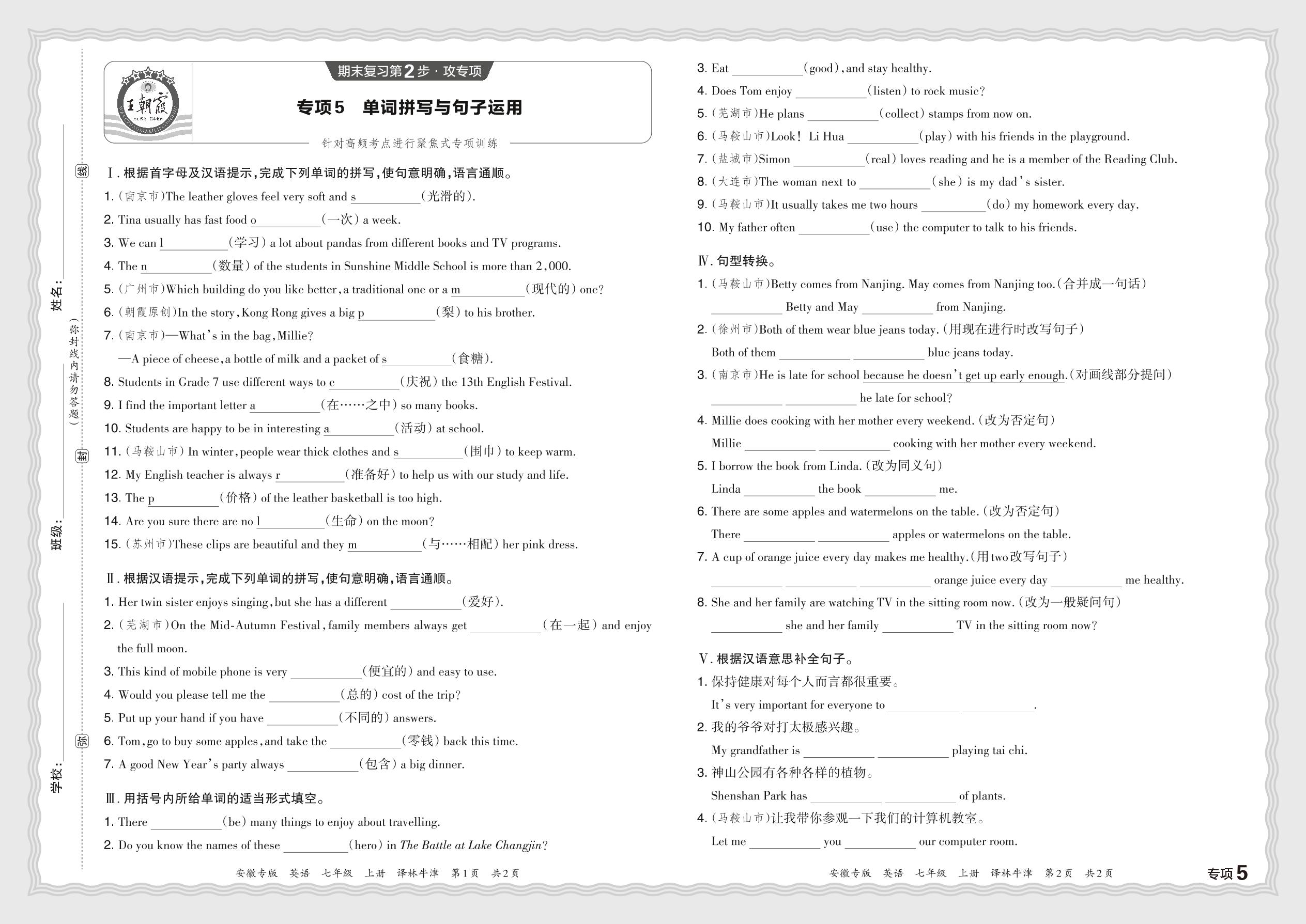 2023秋上册七年级英语译林牛津版 期末专项卷·单词拼写与句子运用【5】