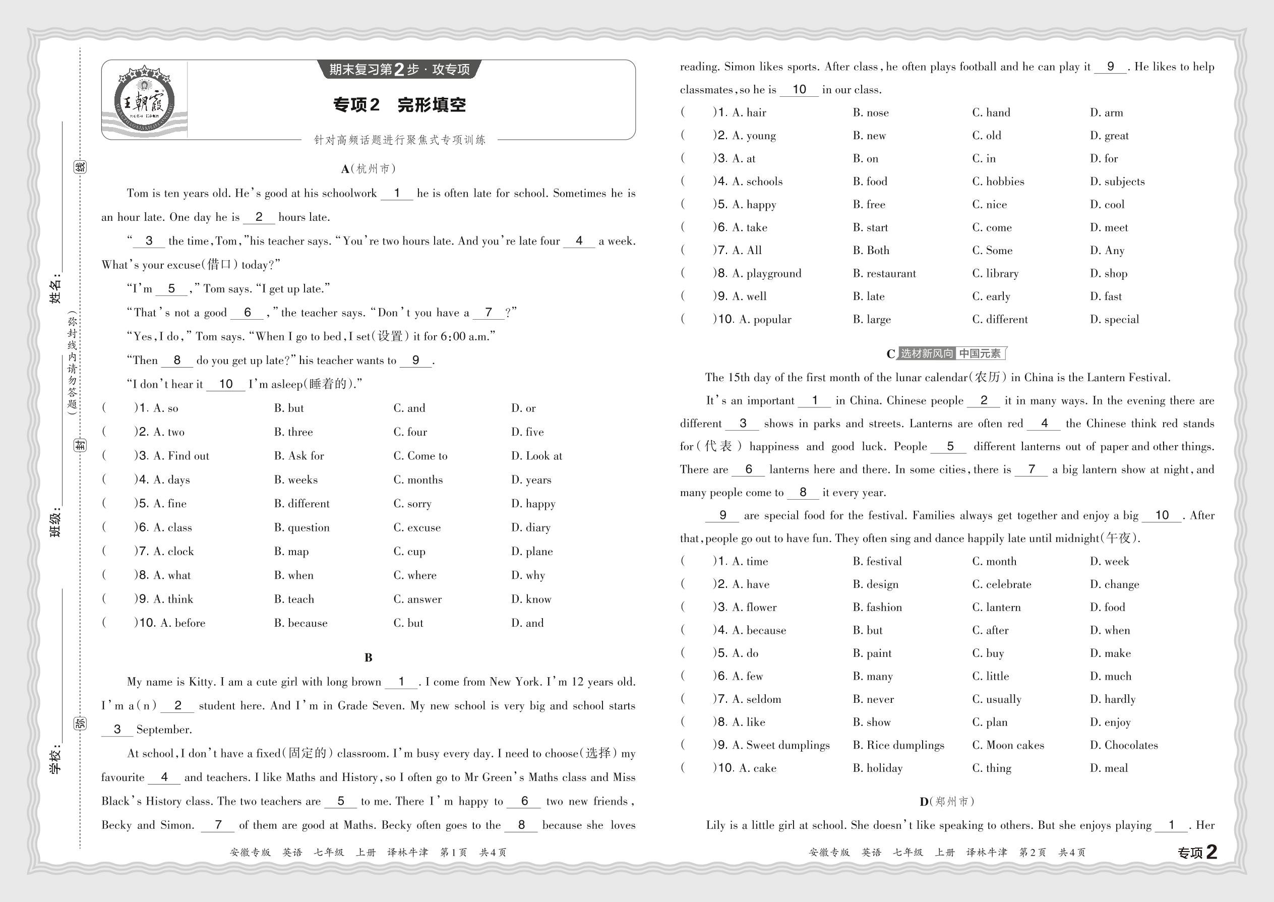 2023秋上册七年级英语译林牛津版 期末专项卷·完形填空【2】
